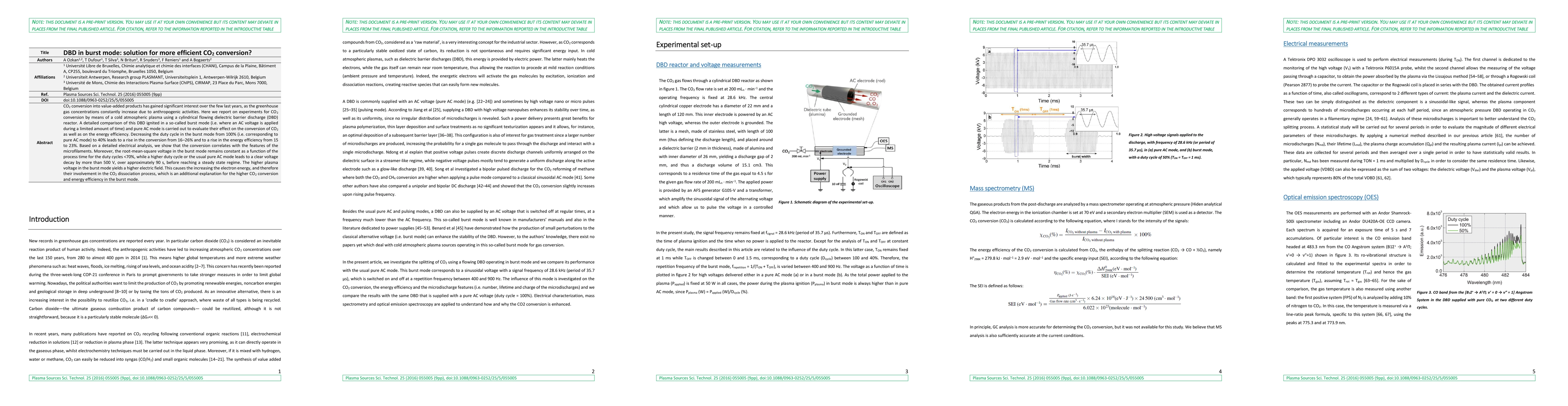 Researchers investigate using a cold atmospheric plasma DBD reactor in burst mode for more efficient CO2 conversion, finding that decreasing duty cycle improves conversion and energy efficiency.