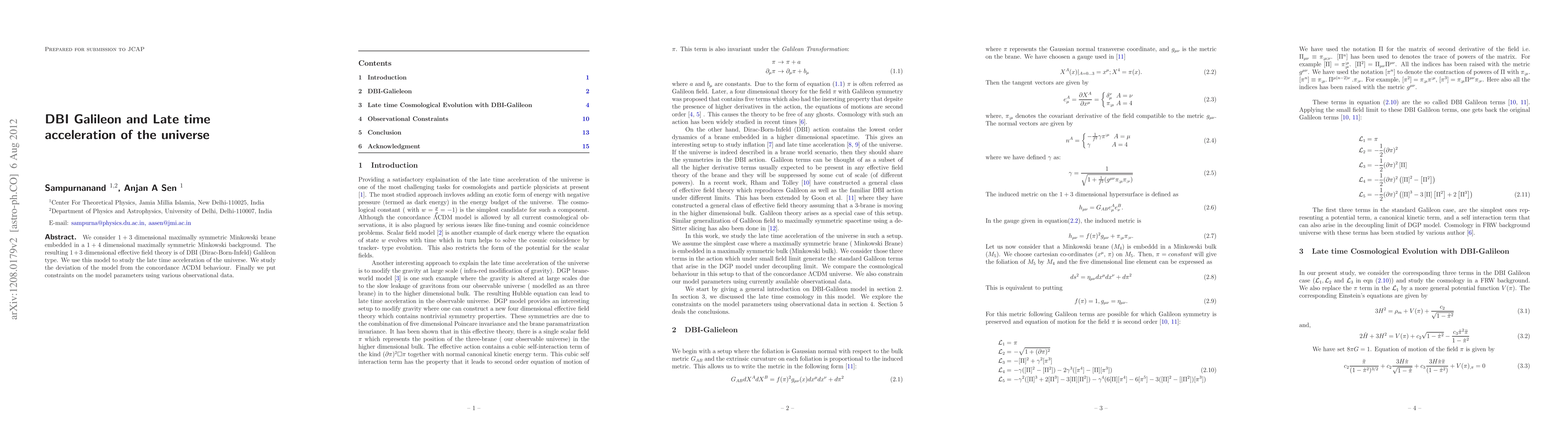 This paper explores a DBI Galileon effective field theory derived from a 1+4 dimensional background to study the late-time acceleration of the universe, comparing its behavior to the standard ΛCDM model and constraining its parameters with observational data.