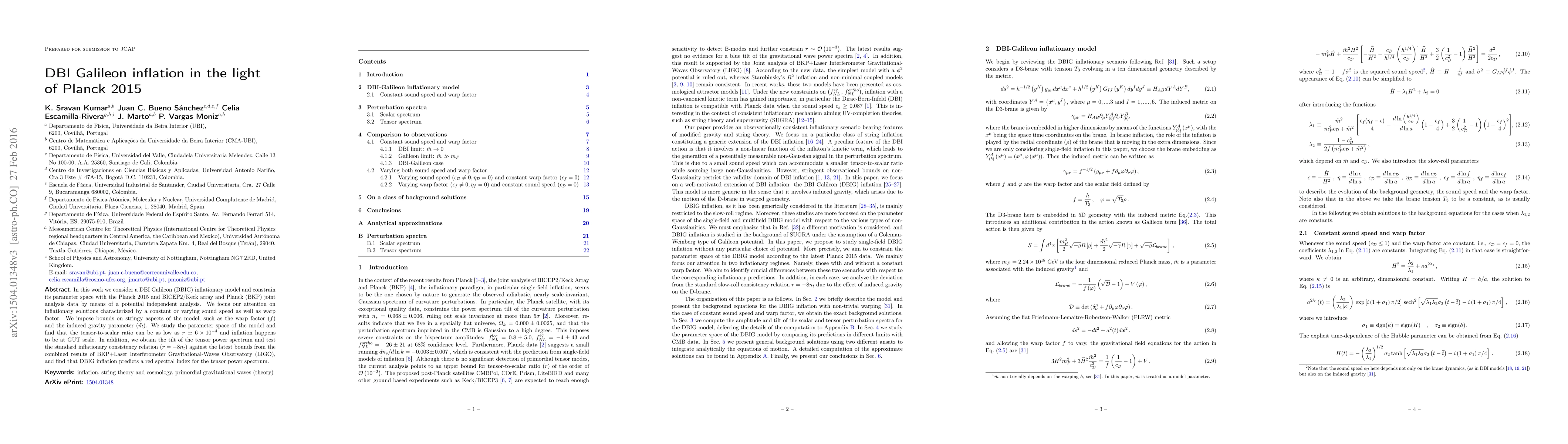 This paper examines a DBI Galileon inflation model, constraining its parameters using Planck 2015 and BICEP2/Keck array data. It finds the tensor-to-scalar ratio can be as low as $r\simeq6\times10^{-4}$ and predicts a red spectral index for the tensor power spectrum.