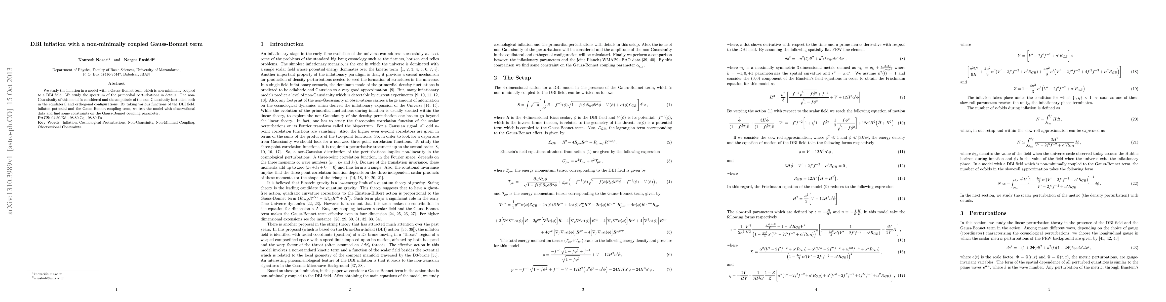 This paper investigates inflation driven by a DBI field with a non-minimally coupled Gauss-Bonnet term, analyzing the spectrum of primordial perturbations and non-Gaussianity in different configurations. It constrains the Gauss-Bonnet coupling parameter by comparing model predictions with observational data.