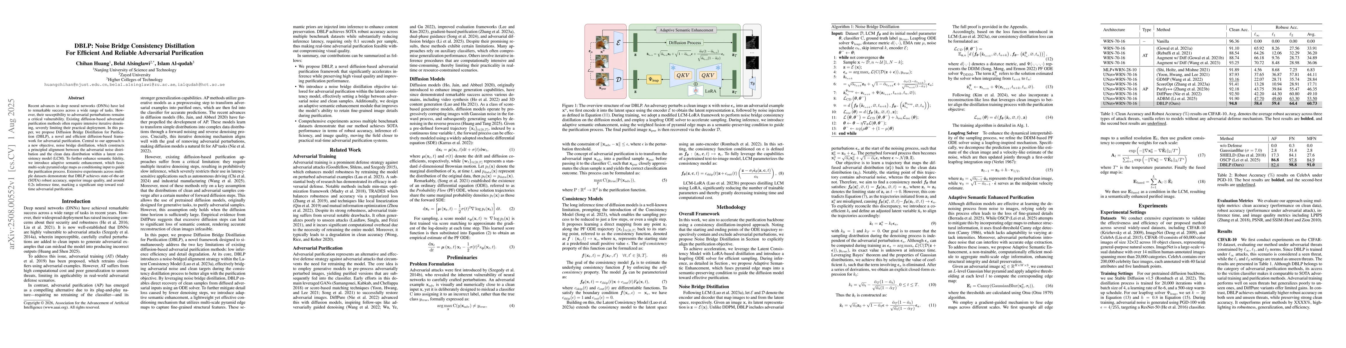 Recent advances in deep neural networks (DNNs) have led to remarkable success across a wide range of tasks. However, their susceptibility to adversarial perturbations remains a critical vulnerability. Existing diffusion-based adversarial purification methods often require intensive iterative denoising, severely limiting their practical deployment. In this paper, we propose Diffusion Bridge Distillation for Purification (DBLP), a novel and efficient diffusion-based framework for adversarial purification. Central to our approach is a new objective, noise bridge distillation, which constructs a principled alignment between the adversarial noise distribution and the clean data distribution within a latent consistency model (LCM). To further enhance semantic fidelity, we introduce adaptive semantic enhancement, which fuses multi-scale pyramid edge maps as conditioning input to guide the purification process. Extensive experiments across multiple datasets demonstrate that DBLP achieves state-of-the-art (SOTA) robust accuracy, superior image quality, and around 0.2s inference time, marking a significant step toward real-time adversarial purification.