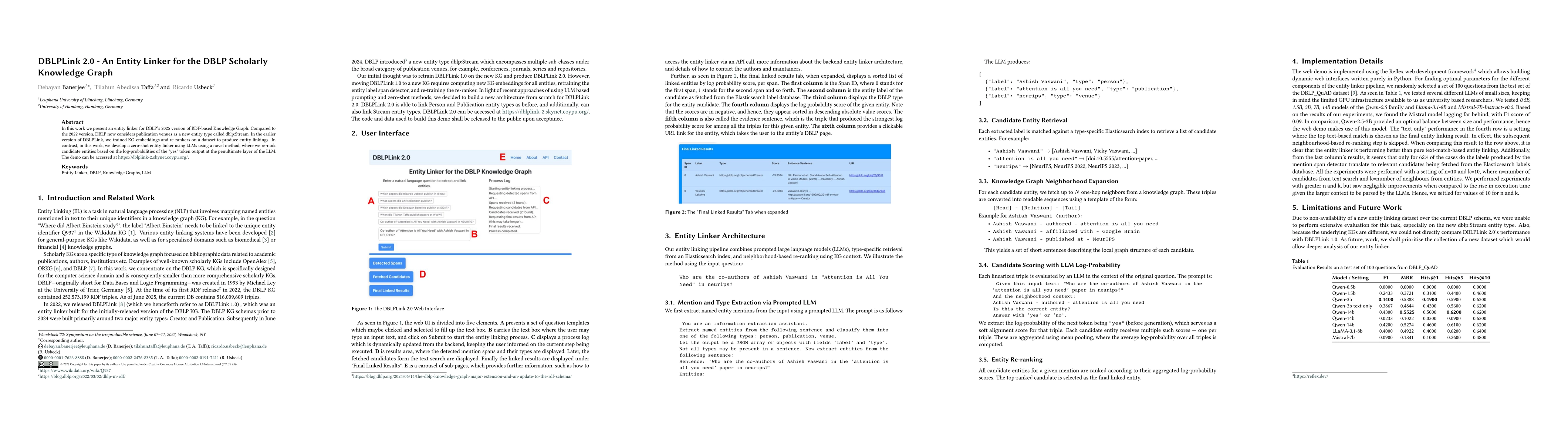 The main technical contribution is the development of a zero-shot entity linker for DBLP's RDF-based knowledge graph using LLMs, which efficiently re-ranks candidate entities based on log-probabilities.
