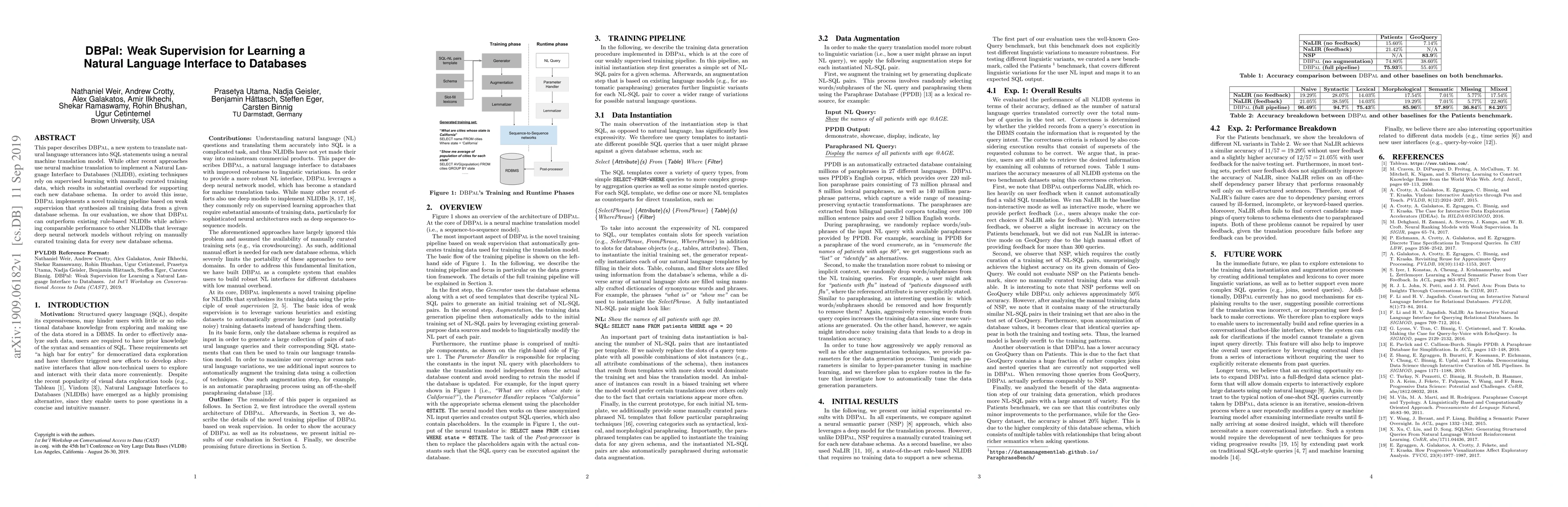 DBPal is a system that uses weak supervision to translate natural language queries into SQL, avoiding the need for manually curated training data. It outperforms rule-based NLIDBs and achieves comparable performance to deep learning-based NLIDBs without the overhead of new schema-specific training.