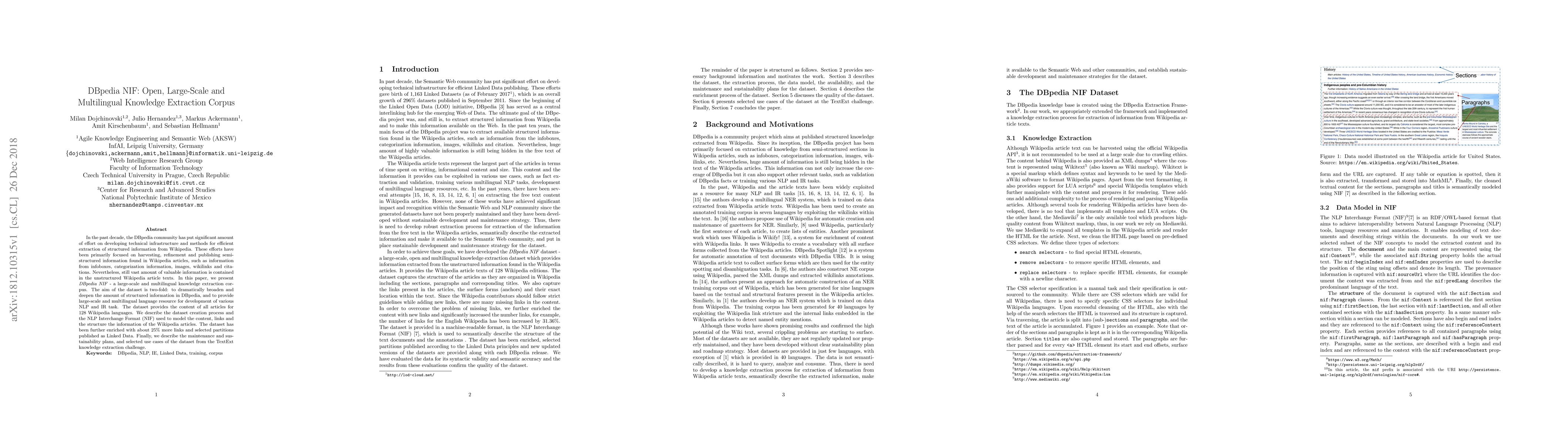 DBpedia NIF is a large-scale, multilingual knowledge extraction corpus aimed at enhancing DBpedia's structured information and serving as a resource for NLP and IR tasks. The dataset includes the content of all articles across 128 Wikipedia languages, enriched with additional links and published as Linked Data.