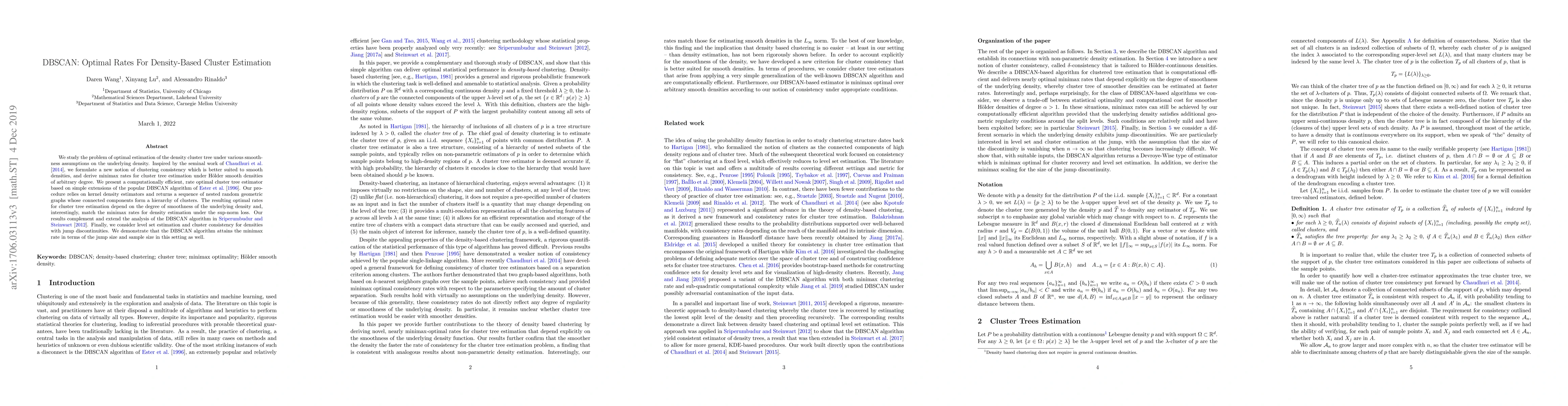 This paper develops optimal rates for density-based clustering using DBSCAN, introducing a new notion of clustering consistency for smooth densities and deriving minimax rates for cluster tree estimation. It presents a computationally efficient DBSCAN extension that matches minimax rates for density estimation and remains optimal for densities with jump discontinuities.