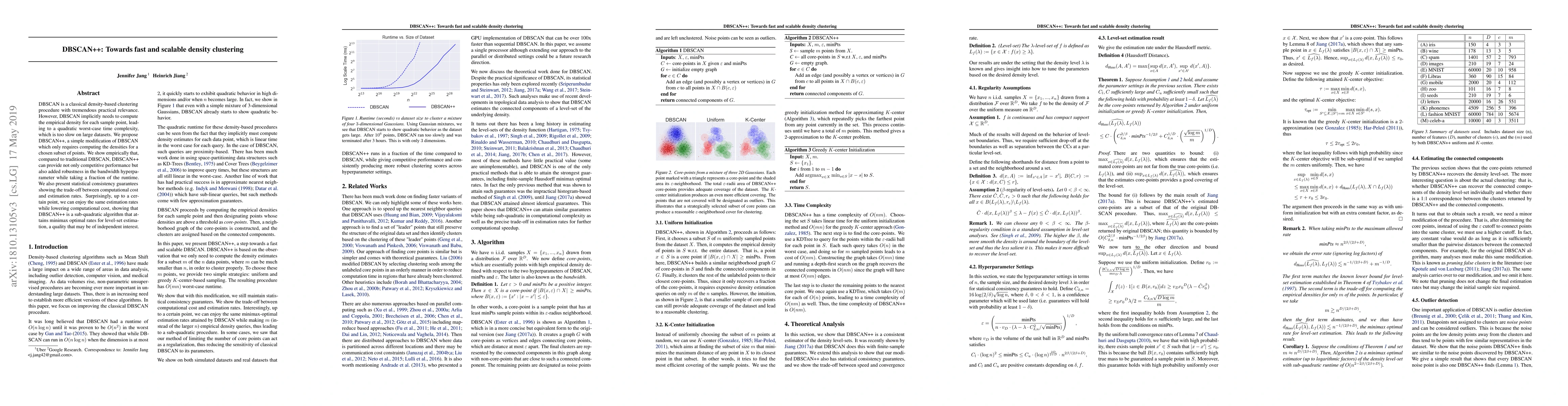 DBSCAN++ is a modified version of DBSCAN that reduces computational complexity by only computing densities for a subset of points, achieving faster runtime and competitive performance while maintaining robustness. It offers sub-quadratic time complexity and minimax optimal rates for level-set estimation.