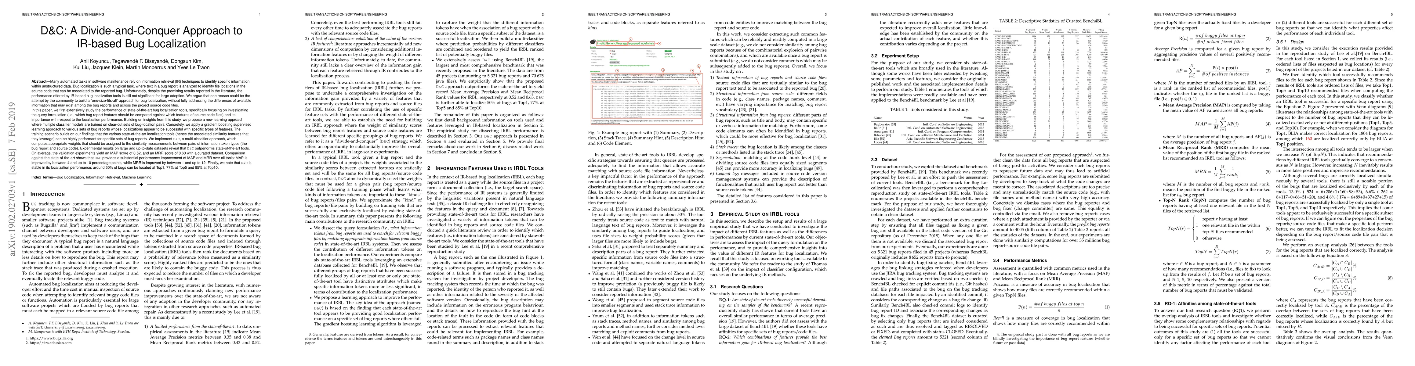 This paper proposes D&C, a divide-and-conquer approach to improve IR-based bug localization by training multiple classifier models on distinct sets of bug-location pairs. Experimental results show D&C significantly outperforms existing tools, achieving a MAP score of 0.52 and an MRR score of 0.63, with notable improvements in both metrics.
