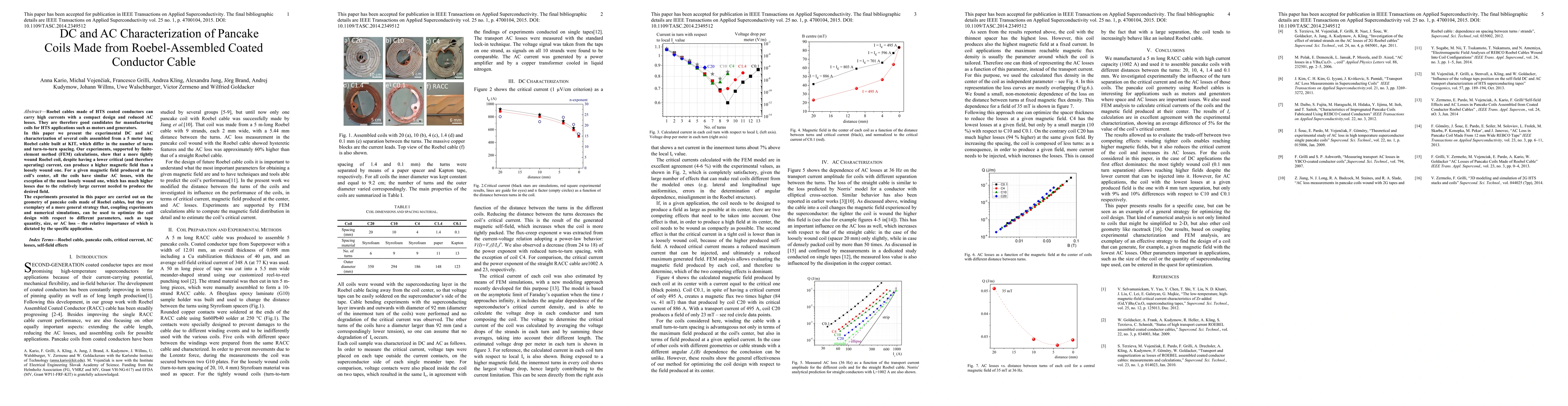 This paper presents experimental DC and AC characterization of pancake coils made from Roebel-assembled coated conductor cables, showing that tighter windings can produce higher magnetic fields despite lower critical currents. The study highlights that for similar central magnetic fields, coils with tighter windings have comparable AC losses, except for the most loosely wound coil which incurs significantly higher losses due to higher current requirements.