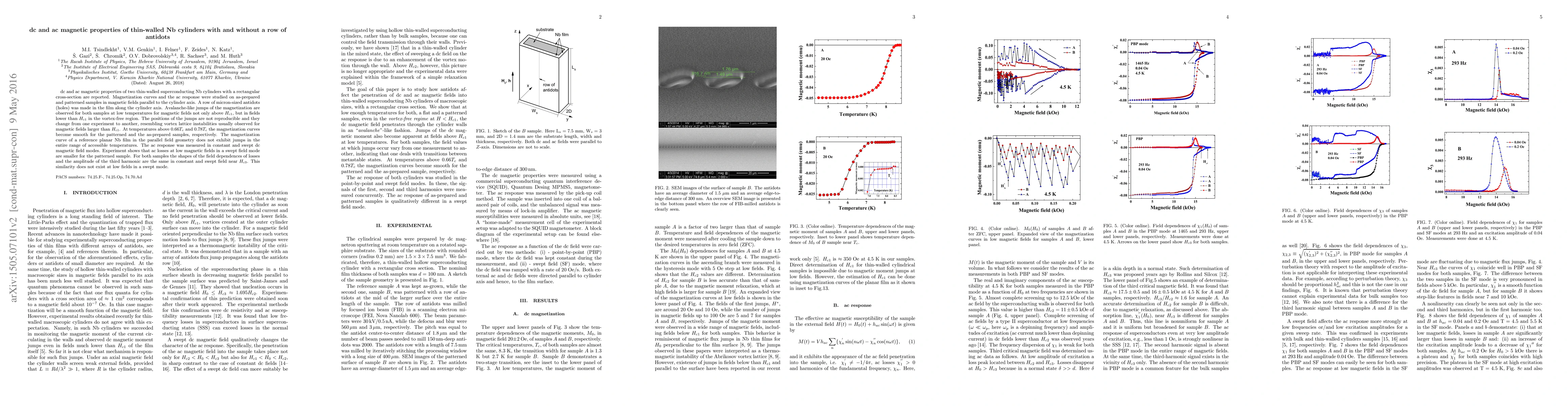 This study investigates the dc and ac magnetic properties of thin-walled Nb cylinders with and without a row of antidots, revealing avalanche-like jumps in magnetization and differing ac loss behaviors between patterned and as-prepared samples, especially at low fields. The patterned sample shows reduced ac losses in swept field modes compared to the as-prepared one.