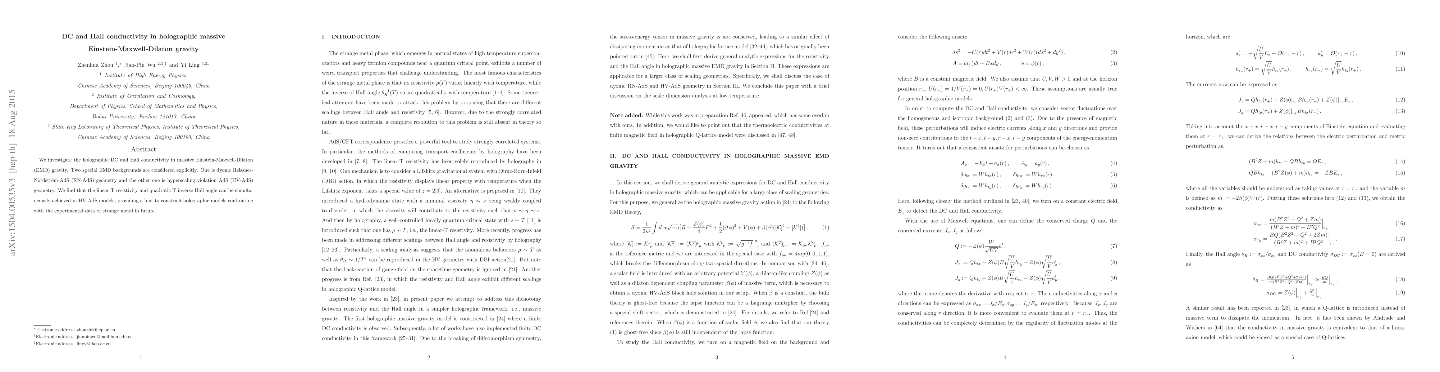 This paper investigates the holographic DC and Hall conductivity in massive Einstein-Maxwell-Dilaton gravity, focusing on dyonic Reissner-Nordström-AdS and hyperscaling violation AdS geometries. It finds that the HV-AdS model can achieve both linear-T resistivity and quadratic-T inverse Hall angle, suggesting potential for constructing holographic models that align with strange metal experimental data.