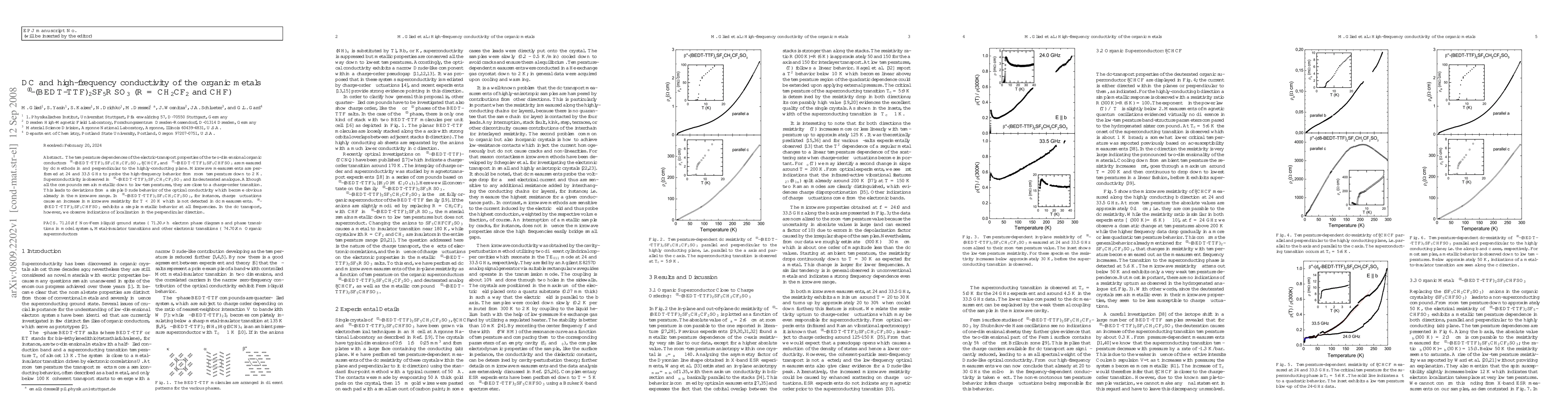 This study investigates the electric-transport properties of two-dimensional organic conductors, revealing superconductivity in beta"-(BEDT-TTF)2SF5CH2CF2SO3 and its deuterated analogue, while beta"-(BEDT-TTF)2SF5CHFSO3 shows simple metallic behavior. High-frequency microwave measurements highlight deviations from Drude behavior due to charge fluctuations.