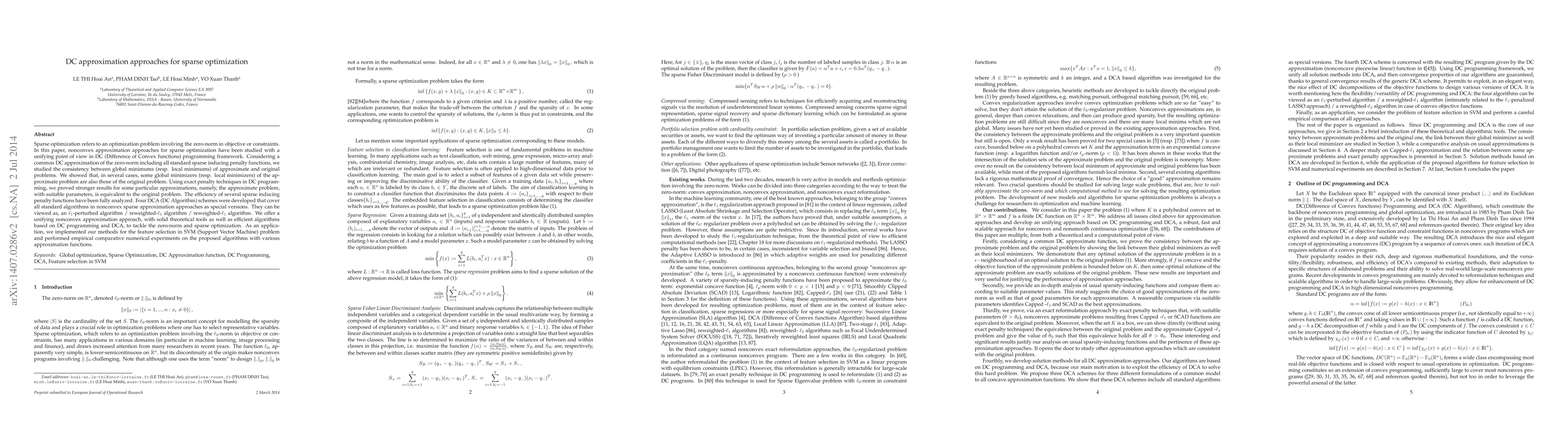 This paper explores nonconvex DC (Difference of Convex functions) programming approaches for sparse optimization, focusing on the zero-norm. It develops four DCA schemes that unify various nonconvex sparse approximation methods and proves their equivalence under certain conditions, demonstrating their application in feature selection for SVMs through empirical experiments.
