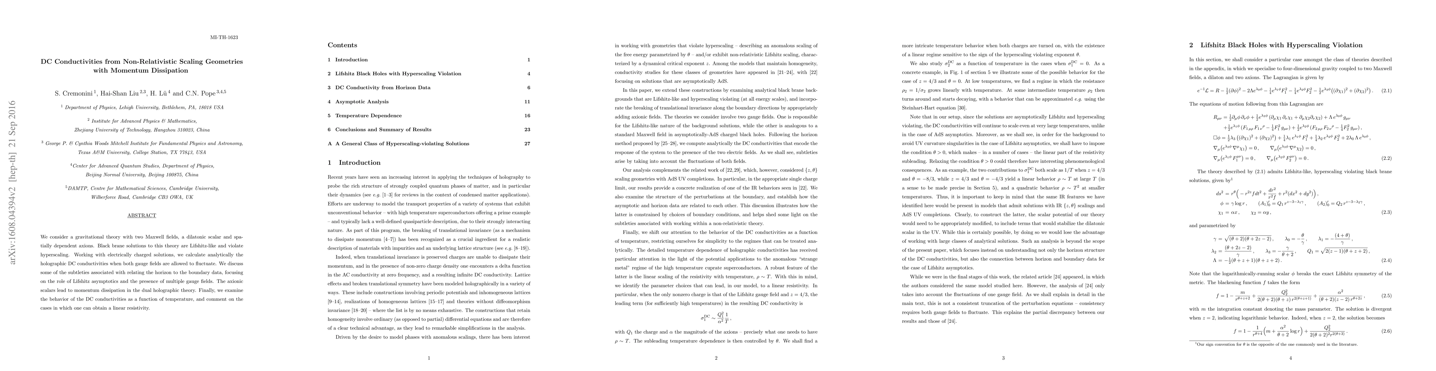 We consider a gravitational theory with two Maxwell fields, a dilatonic scalar and spatially dependent axions. Black brane solutions to this theory are Lifshitz-like and violate hyperscaling. Working with electrically charged solutions, we calculate analytically the holographic DC conductivities when both gauge fields are allowed to fluctuate. We discuss some of the subtleties associated with relating the horizon to the boundary data, focusing on the role of Lifshitz asymptotics and the presence of multiple gauge fields. The axionic scalars lead to momentum dissipation in the dual holographic theory. Finally, we examine the behavior of the DC conductivities as a function of temperature, and comment on the cases in which one can obtain a linear resistivity.