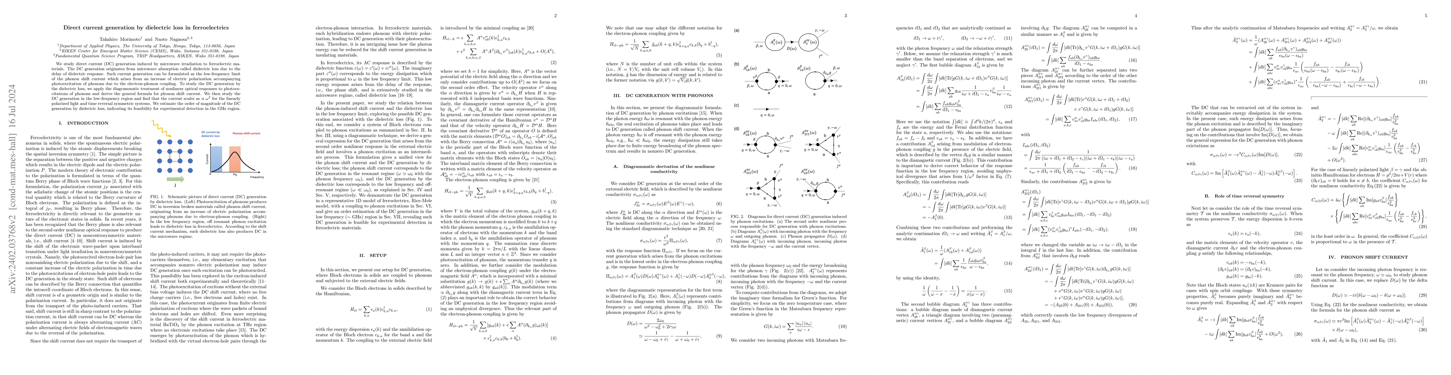 We study dc current generation induced by microwave irradiation to ferroelectric materials. The dc current generation originates from microwave absorption called dielectric loss due to the delay of dielectric response. Such current generation can be formulated as the low-frequency limit of the phonon shift current which arises from an increase of electric polarization accompanying photoexcitation of phonons due to the electron-phonon coupling. To study the dc current generation by the dielectric loss, we apply the diagrammatic treatment of nonlinear optical responses to photoexcitations of phonons and derive the general formula for phonon shift current. We then study the dc current generation in the low-frequency region and find that the dc current scales as $\propto w^2$ for the linearly polarized light and time reversal symmetric systems. We estimate the order of magnitude of the dc current generation by dielectric loss, indicating its feasibility for experimental detection in the GHz region.