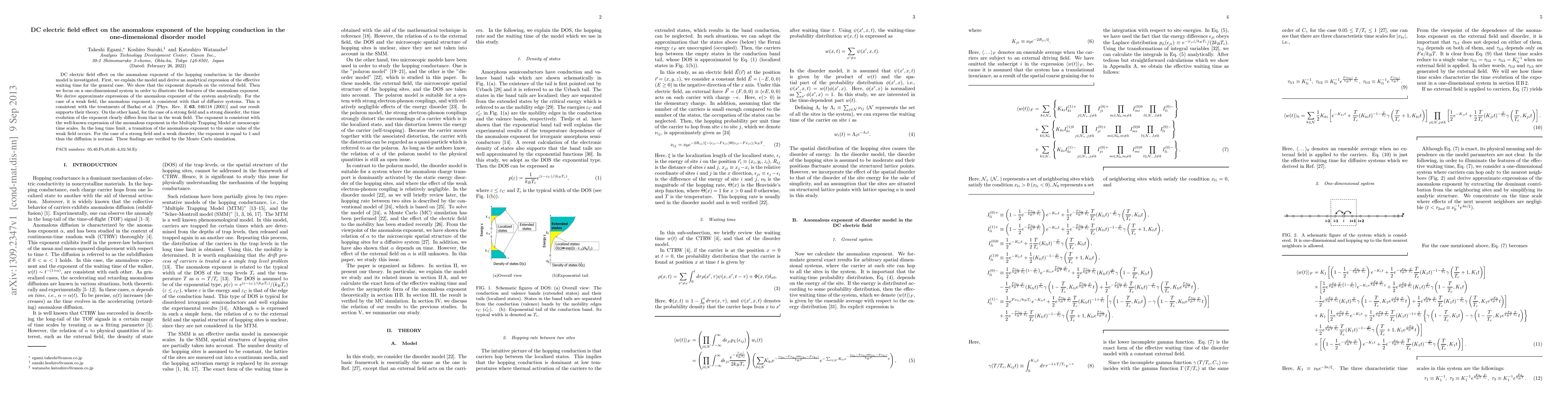 DC electric field effect on the anomalous exponent of the hopping conduction in the disorder model is investigated. First, we explain the model and derive an analytical expression of the effective waiting time for the general case. We show that the exponent depends on the external field. Then we focus on a one-dimensional system in order to illustrate the features of the anomalous exponent. We derive approximate expressions of the anomalous exponent of the system analytically. For the case of a weak field, the anomalous exponent is consistent with that of diffusive systems. This is consistent with the treatments of Barkai et al. [Phys. Rev. E {\bf 63}, 046118 (2001)] and our result supports their theory. On the other hand, for the case of a strong field and a strong disorder, the time evolution of the exponent clearly differs from that in the weak field. The exponent is consistent with the well-known expression of the anomalous exponent in the Multiple Trapping Model at mesoscopic time scales. In the long time limit, a transition of the anomalous exponent to the same value of the weak field occurs. For the case of a strong field and a weak disorder, the exponent is equal to 1 and thus the diffusion is normal. These findings are verified by the Monte Carlo simulation.
