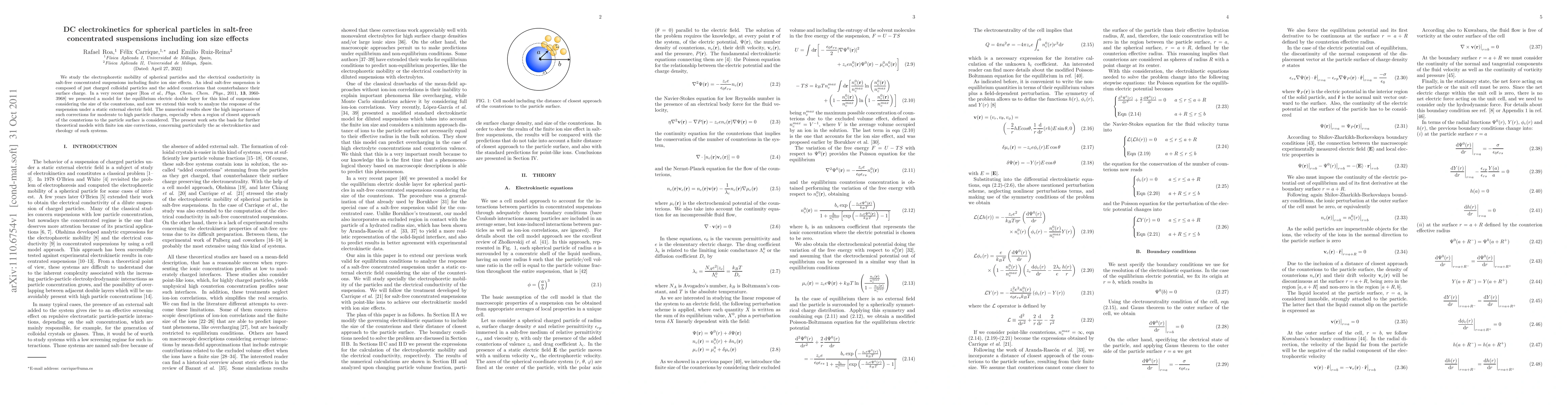 This paper investigates the electrophoretic mobility and electrical conductivity of salt-free concentrated suspensions of spherical particles, considering the effects of finite ion size. It extends previous models to include the response under a static electric field, highlighting the significance of ion size corrections for high particle charges.