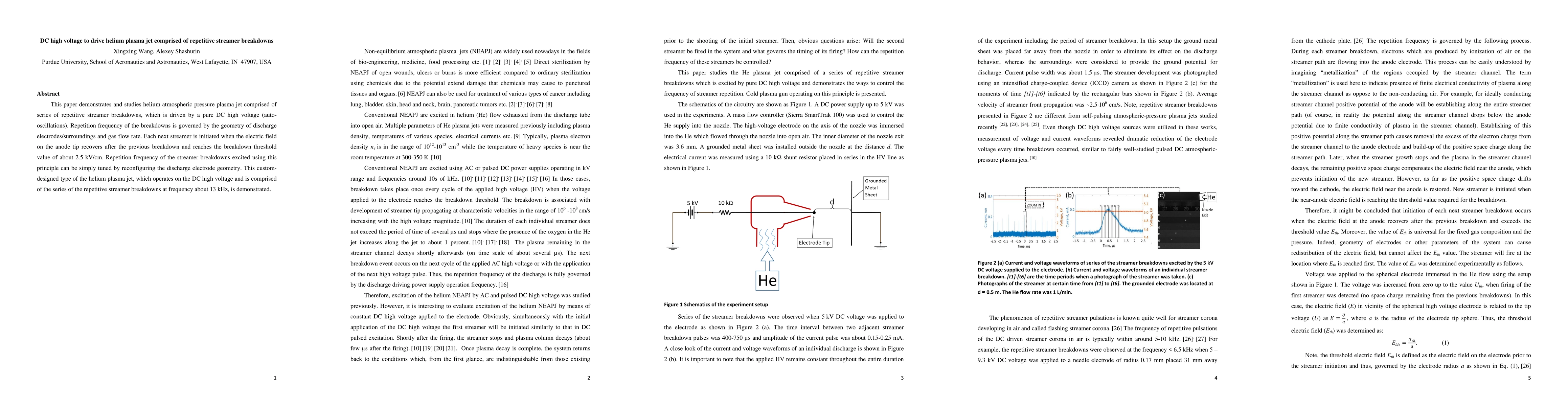 This paper investigates a helium plasma jet driven by a DC high voltage, characterized by repetitive streamer breakdowns, with its frequency tunable by electrode geometry and gas flow rate. The jet operates at a frequency of approximately 13 kHz, initiated by electric field recovery to a threshold value of 2.5 kV/cm.