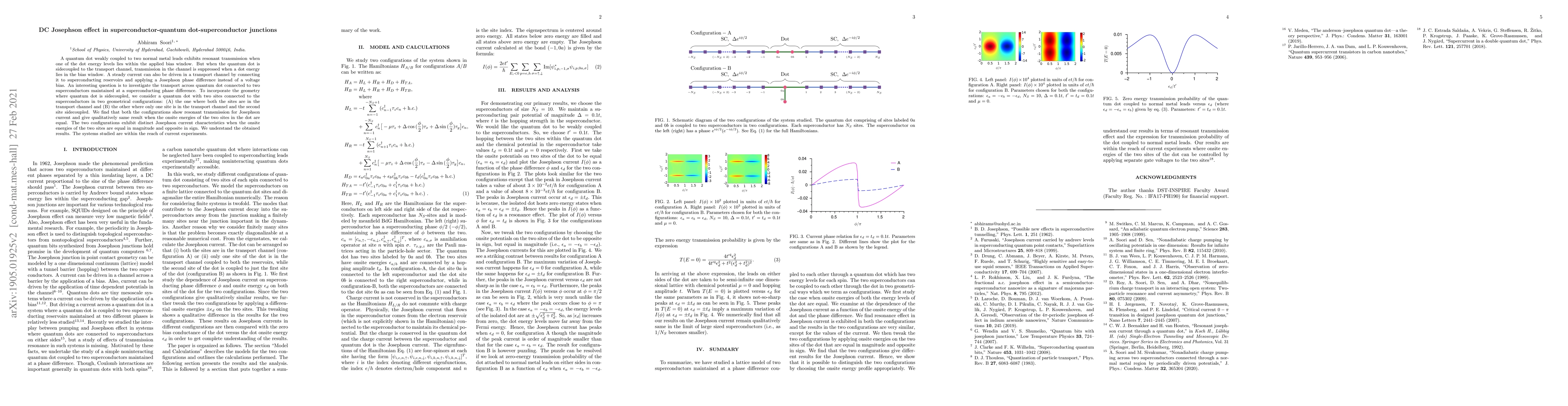 This paper investigates the DC Josephson effect in superconductor-quantum dot-superconductor junctions, exploring two configurations: one where both quantum dot sites are in the transport channel and another where one site is sidecoupled. Both configurations show resonant transmission for Josephson current, with distinct characteristics when the onsite energies are equal in magnitude but opposite in sign.