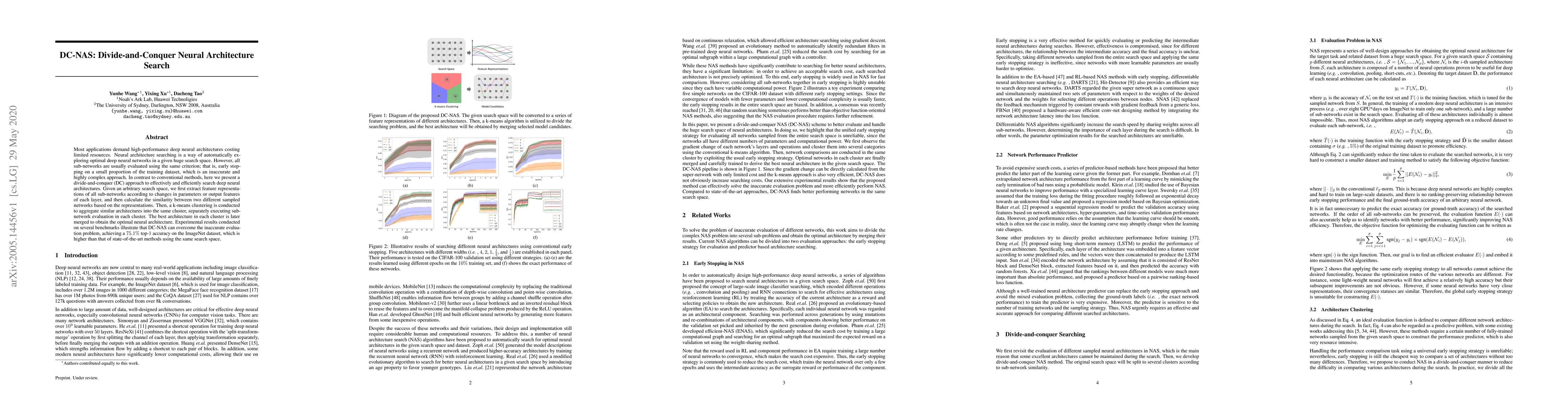 Most applications demand high-performance deep neural architectures costing limited resources. Neural architecture searching is a way of automatically exploring optimal deep neural networks in a given huge search space. However, all sub-networks are usually evaluated using the same criterion; that is, early stopping on a small proportion of the training dataset, which is an inaccurate and highly complex approach. In contrast to conventional methods, here we present a divide-and-conquer (DC) approach to effectively and efficiently search deep neural architectures. Given an arbitrary search space, we first extract feature representations of all sub-networks according to changes in parameters or output features of each layer, and then calculate the similarity between two different sampled networks based on the representations. Then, a k-means clustering is conducted to aggregate similar architectures into the same cluster, separately executing sub-network evaluation in each cluster. The best architecture in each cluster is later merged to obtain the optimal neural architecture. Experimental results conducted on several benchmarks illustrate that DC-NAS can overcome the inaccurate evaluation problem, achieving a $75.1\%$ top-1 accuracy on the ImageNet dataset, which is higher than that of state-of-the-art methods using the same search space.