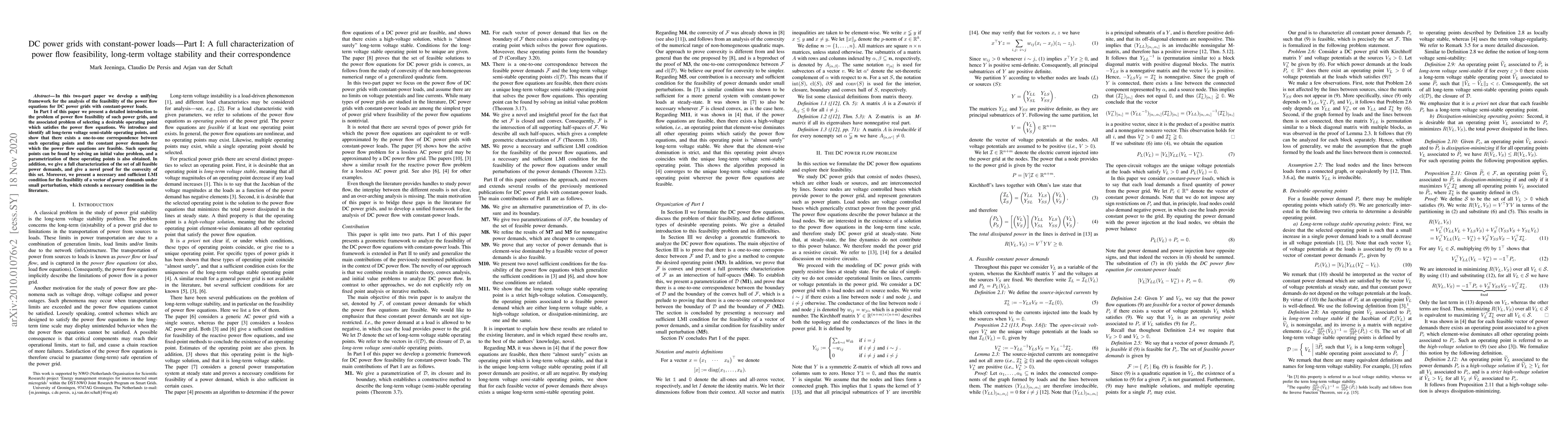This paper introduces a framework for analyzing the power flow feasibility in DC power grids with constant-power loads, identifying long-term voltage semi-stable operating points and proving a one-to-one correspondence between these points and feasible power demands. It also provides a novel characterization of the set of feasible power demands and an LMI condition for their feasibility under small perturbations.