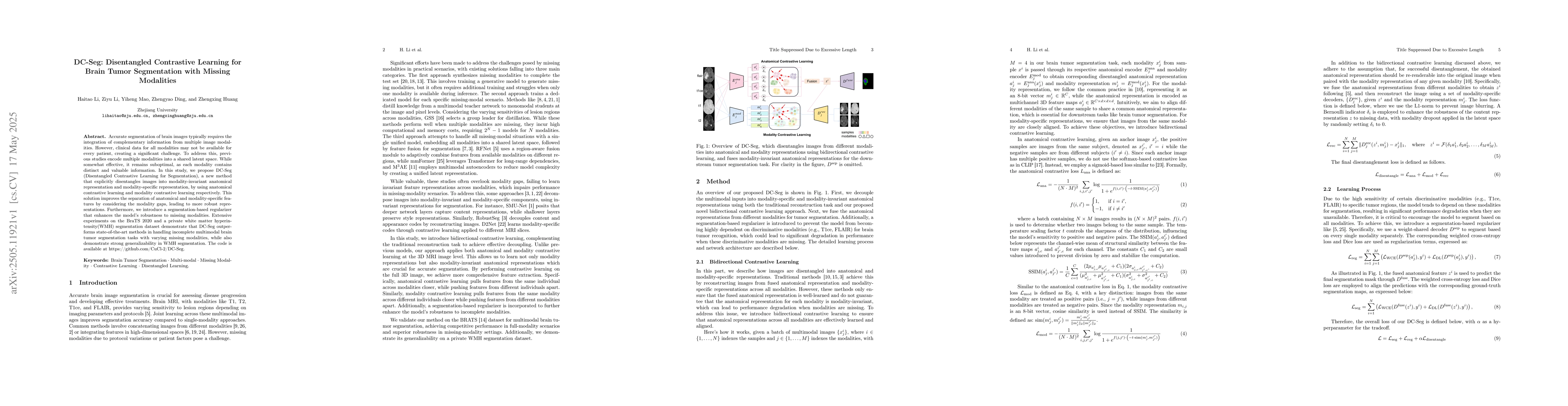 A new method called DC-Seg is proposed to improve brain tumor segmentation with missing modalities by disentangling images into anatomical and modality-specific representations, outperforming state-of-the-art methods in experiments.