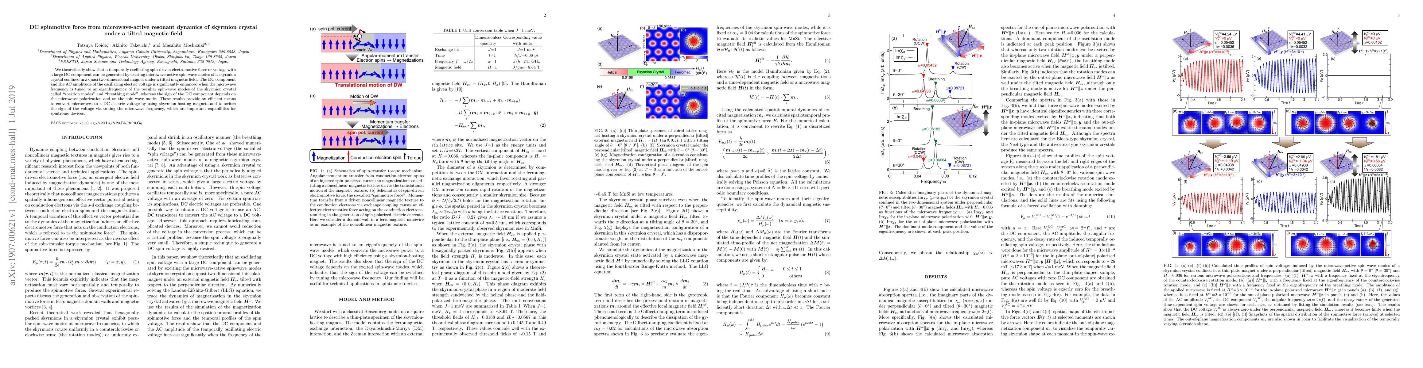 This paper theoretically demonstrates the generation of a spin-driven electromotive force with a significant DC component by exciting microwave-active spin-wave modes in a skyrmion crystal under a tilted magnetic field. The DC voltage's magnitude and sign can be controlled by tuning the microwave frequency to specific eigenfrequencies, offering a potential method for converting microwaves to DC voltage in spintronic devices.