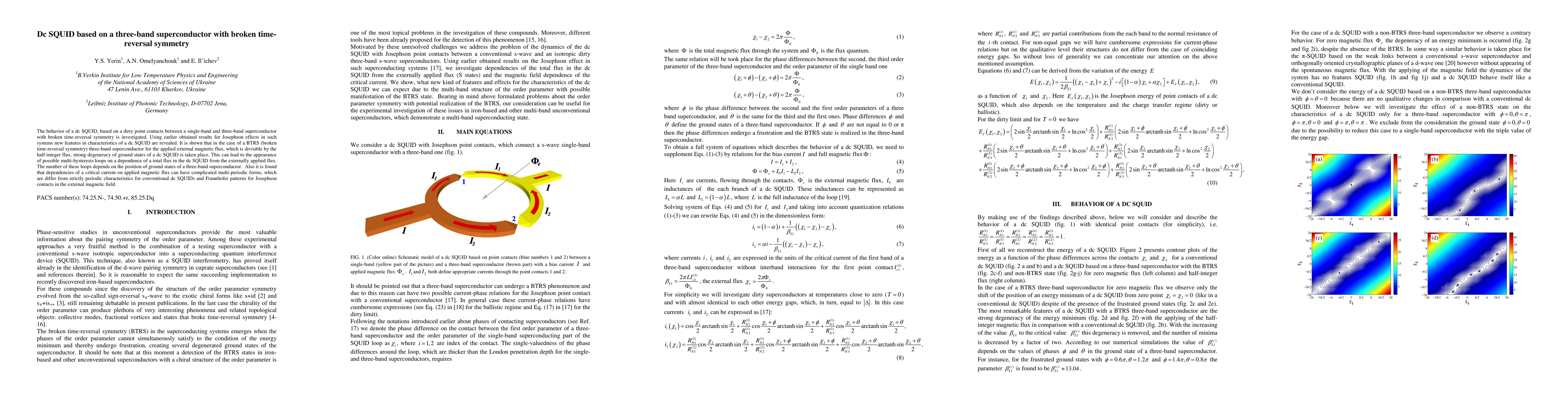 This paper investigates the unique behavior of a dc SQUID utilizing dirty point contacts between single-band and three-band superconductors with broken time-reversal symmetry. It reveals that under specific magnetic flux conditions, the dc SQUID may exhibit multi-hysteresis loops and complex, non-periodic critical current dependencies, differing from conventional SQUID characteristics.