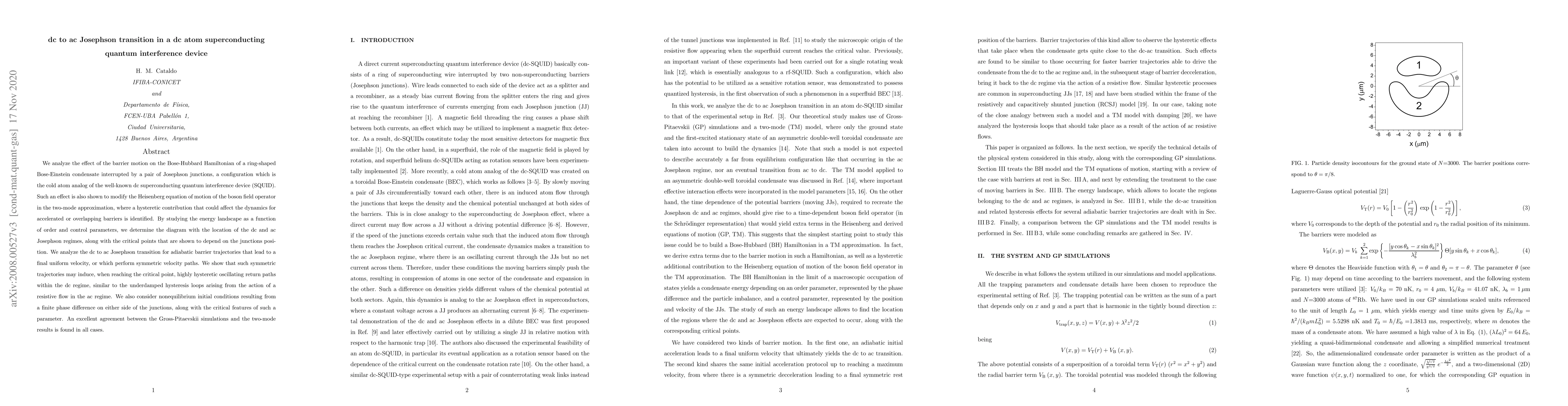 This paper investigates the dc to ac Josephson transition in a cold atom system modeled by a Bose-Hubbard Hamiltonian with Josephson junctions, analogous to a SQUID. It identifies hysteretic dynamics and critical points dependent on junction positions, showing that symmetric barrier trajectories can induce highly hysteretic oscillations within the dc regime.