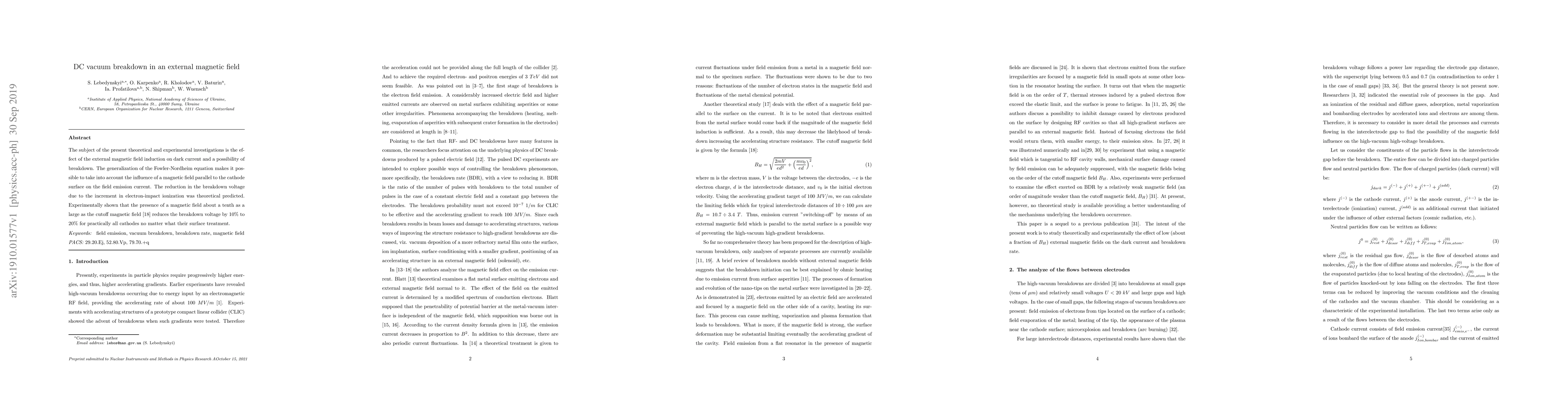 The presence of a magnetic field reduces the breakdown voltage of DC vacuum breakdown in cathodes by 10% to 20%, regardless of surface treatment.
