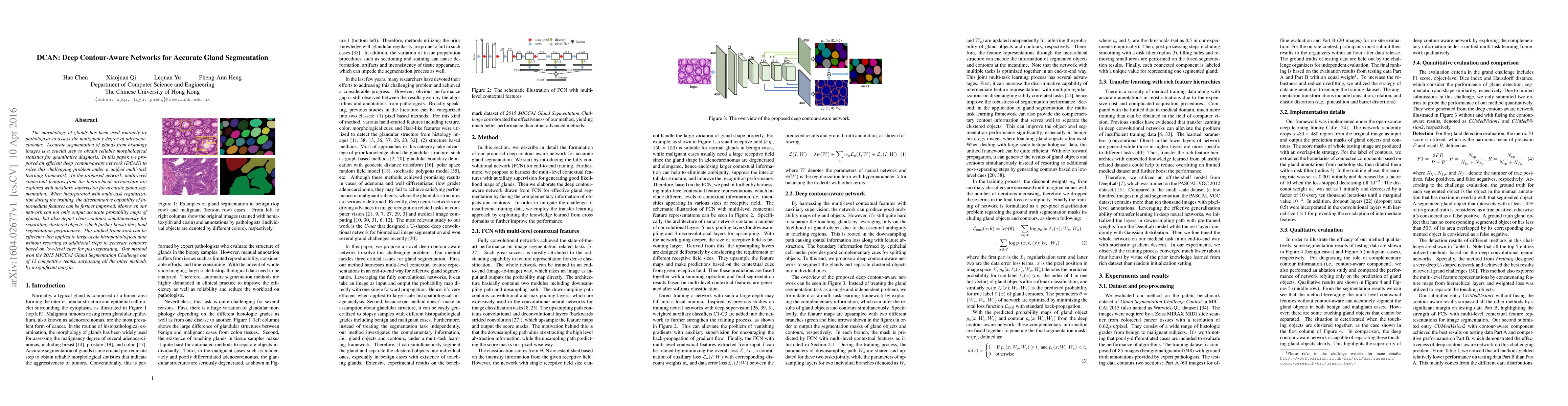 The paper proposes DCAN, a deep contour-aware network for accurate gland segmentation in histology images, utilizing multi-task learning and multi-level contextual features to enhance segmentation performance. The method won the 2015 MICCAI Gland Segmentation Challenge, demonstrating superior results compared to other competitive teams.