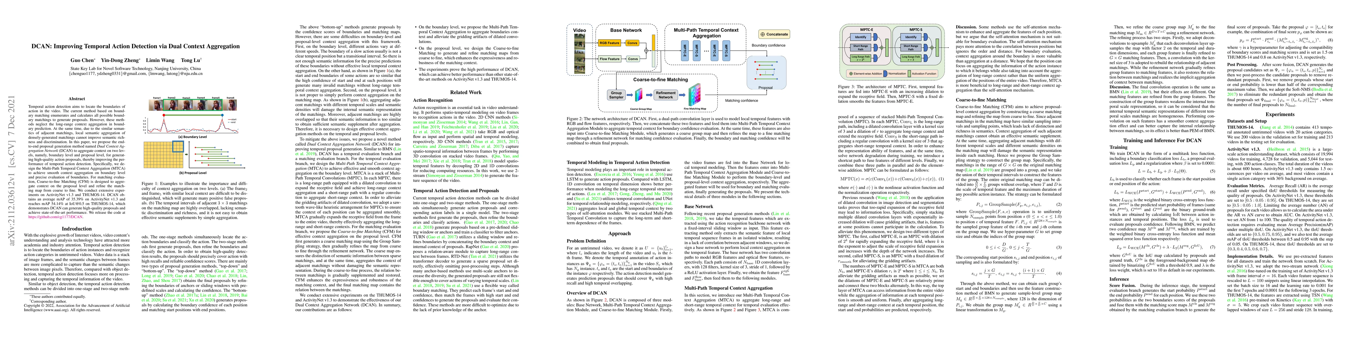 Temporal action detection aims to locate the boundaries of action in the video. The current method based on boundary matching enumerates and calculates all possible boundary matchings to generate proposals. However, these methods neglect the long-range context aggregation in boundary prediction. At the same time, due to the similar semantics of adjacent matchings, local semantic aggregation of densely-generated matchings cannot improve semantic richness and discrimination. In this paper, we propose the end-to-end proposal generation method named Dual Context Aggregation Network (DCAN) to aggregate context on two levels, namely, boundary level and proposal level, for generating high-quality action proposals, thereby improving the performance of temporal action detection. Specifically, we design the Multi-Path Temporal Context Aggregation (MTCA) to achieve smooth context aggregation on boundary level and precise evaluation of boundaries. For matching evaluation, Coarse-to-fine Matching (CFM) is designed to aggregate context on the proposal level and refine the matching map from coarse to fine. We conduct extensive experiments on ActivityNet v1.3 and THUMOS-14. DCAN obtains an average mAP of 35.39% on ActivityNet v1.3 and reaches mAP 54.14% at [email protected] on THUMOS-14, which demonstrates DCAN can generate high-quality proposals and achieve state-of-the-art performance. We release the code at https://github.com/cg1177/DCAN.
