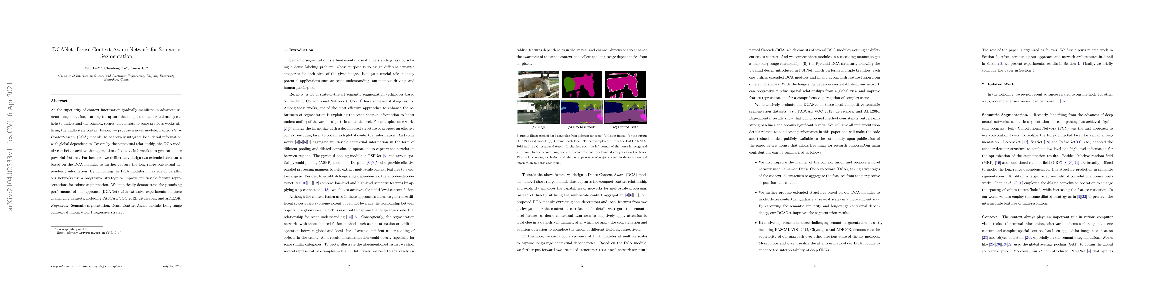 DCANet proposes a novel Dense Context-Aware module to integrate local detail information with global dependencies for semantic segmentation, achieving promising performance on challenging datasets.