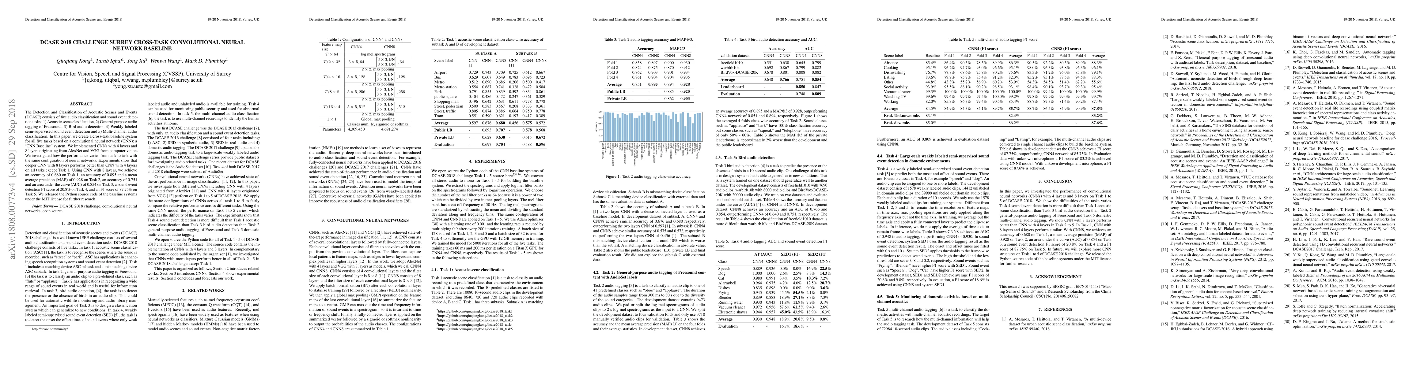 This paper presents a cross-task convolutional neural network (CNN) baseline system for five audio classification and sound event detection tasks in the DCASE 2018 Challenge. The study finds that deeper CNNs with 8 layers outperform 4-layer CNNs across most tasks, achieving notable accuracy and precision scores.