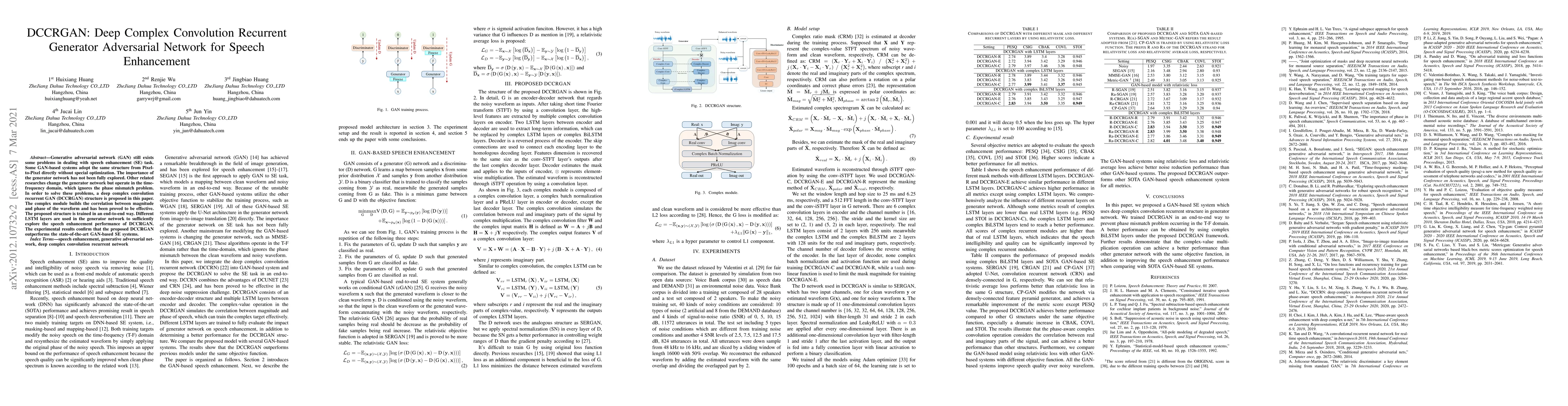 The paper proposes a Deep Complex Convolution Recurrent GAN (DCCRGAN) for speech enhancement, addressing the limitations of existing GAN structures by using complex convolutions to manage magnitude-phase correlations and LSTM layers to improve performance. The end-to-end trained model outperforms current state-of-the-art GAN-based systems.