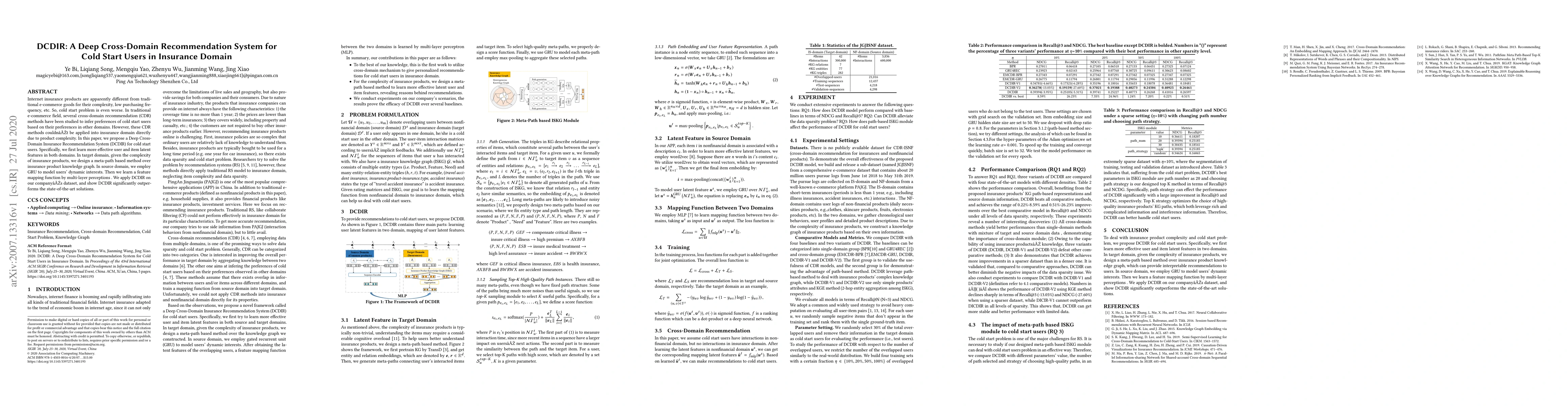 The paper proposes DCDIR, a Deep Cross-Domain Recommendation System for addressing the cold start problem in the insurance domain. It leverages meta paths and GRU networks to learn user and item features, and a feature mapping function to bridge domains, significantly outperforming existing methods on company datasets.