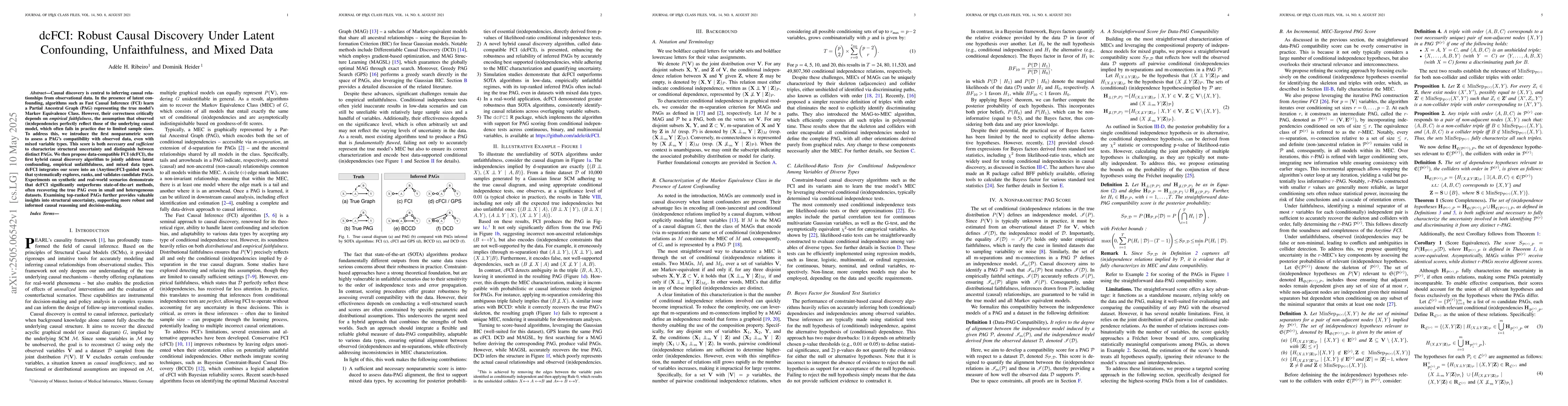 This research is important as it tackles critical issues in causal discovery, such as latent confounding, empirical unfaithfulness, and mixed data types, which are common in practical scenarios. By providing a robust algorithm (dcFCI) and a novel scoring method, it supports more informed causal reasoning and decision-making.
