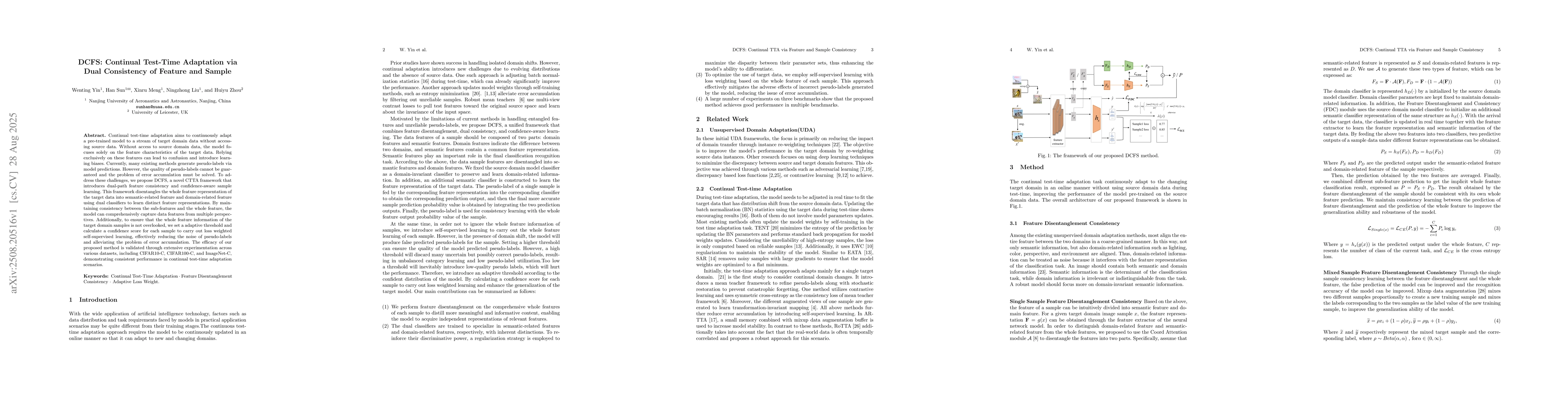 Continual test-time adaptation aims to continuously adapt a pre-trained model to a stream of target domain data without accessing source data. Without access to source domain data, the model focuses solely on the feature characteristics of the target data. Relying exclusively on these features can lead to confusion and introduce learning biases. Currently, many existing methods generate pseudo-labels via model predictions. However, the quality of pseudo-labels cannot be guaranteed and the problem of error accumulation must be solved. To address these challenges, we propose DCFS, a novel CTTA framework that introduces dual-path feature consistency and confidence-aware sample learning. This framework disentangles the whole feature representation of the target data into semantic-related feature and domain-related feature using dual classifiers to learn distinct feature representations. By maintaining consistency between the sub-features and the whole feature, the model can comprehensively capture data features from multiple perspectives. Additionally, to ensure that the whole feature information of the target domain samples is not overlooked, we set a adaptive threshold and calculate a confidence score for each sample to carry out loss weighted self-supervised learning, effectively reducing the noise of pseudo-labels and alleviating the problem of error accumulation. The efficacy of our proposed method is validated through extensive experimentation across various datasets, including CIFAR10-C, CIFAR100-C, and ImageNet-C, demonstrating consistent performance in continual test-time adaptation scenarios.