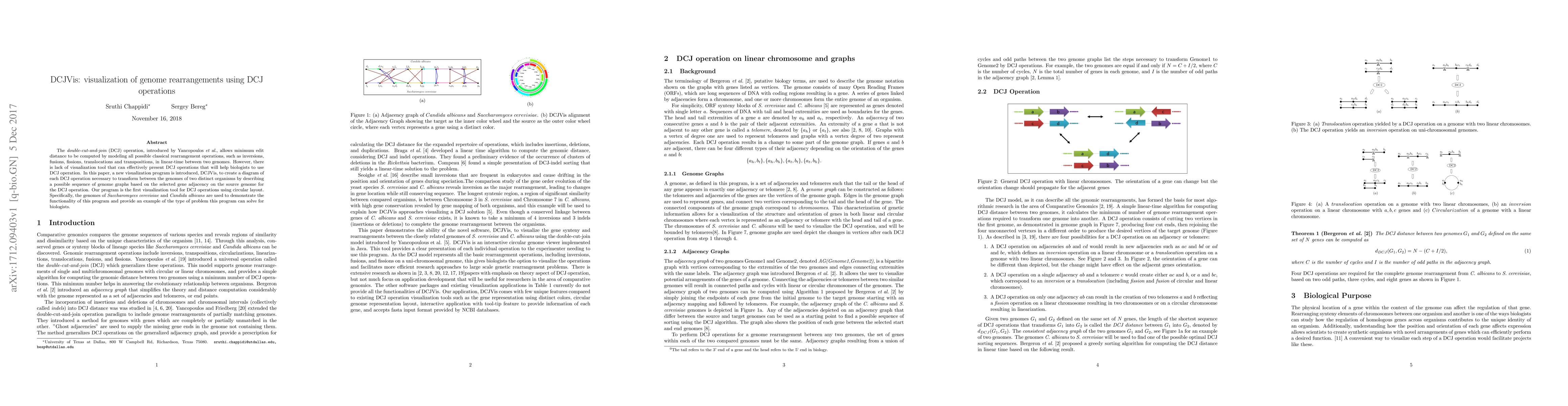 The {\em double-cut-and-join} (DCJ) operation, introduced by Yancopoulos \emph{et al.}, allows minimum edit distance to be computed by modeling all possible classical rearrangement operations, such as inversions, fusions, fissions, translocations, and transpositions, in linear-time between two genomes. However, there is lack of visualization tool that can effectively present DCJ operations that will help biologists to use DCJ operation. In this paper, a new visualization program is introduced, DCJVis, to create a diagram of each DCJ operation necessary to transform between the genomes of two distinct organisms by describing a possible sequence of genome graphs based on the selected gene adjacency on the source genome for the DCJ operation. Our program is the first visualization tool for DCJ operations using circular layout. Specifically, the genomes of \textit{Saccharomyces cerevisiae} and \textit{Candida albicans} are used to demonstrate the functionality of this program and provide an example of the type of problem this program can solve for biologists.