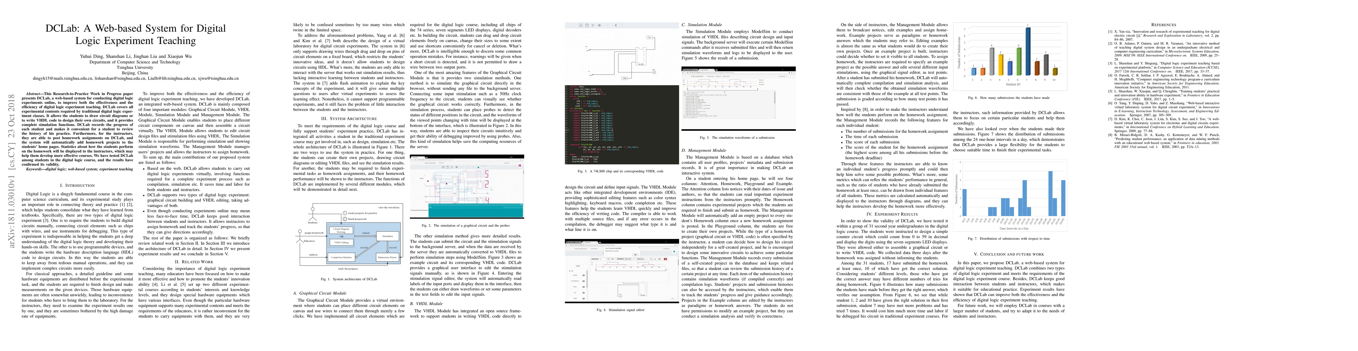 DCLab is a web-based system designed to enhance digital logic experiment teaching through online circuit design and simulation. It supports student-driven circuit diagrams and VHDL coding, and provides automatic assignment posting and performance tracking for instructors.