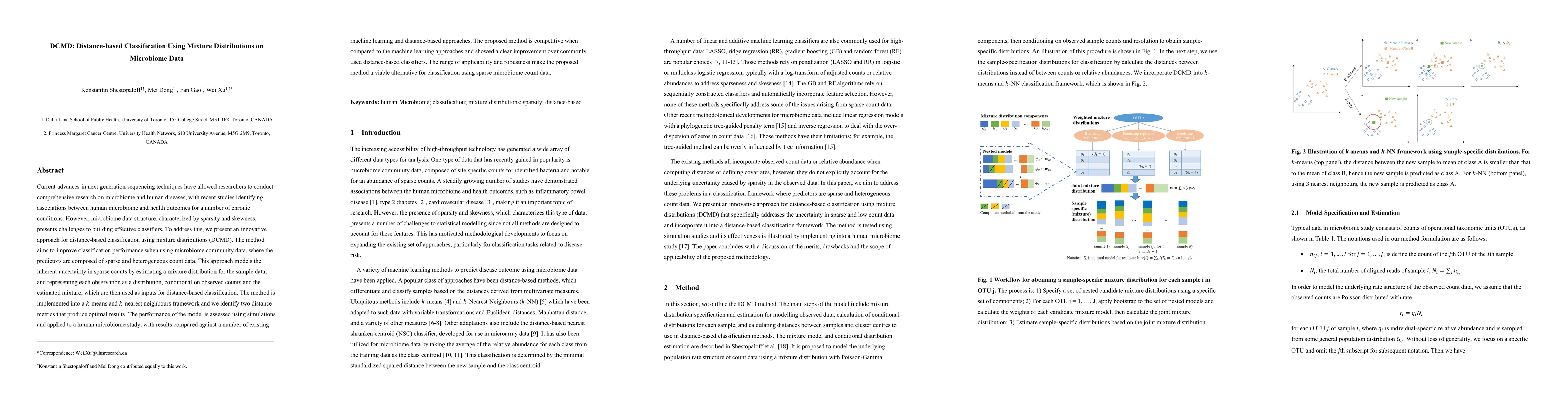 DCMD is a novel distance-based classification method using mixture distributions to handle the sparsity and skewness in microbiome data, showing competitive performance against existing machine learning and distance-based classifiers in both simulations and real-world microbiome studies.