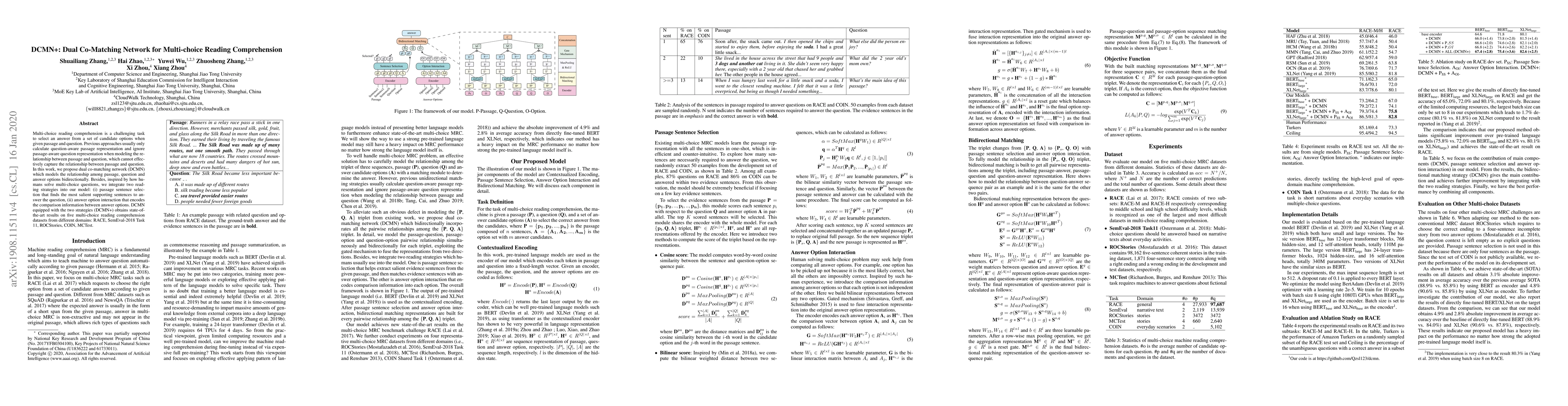 The paper proposes DCMN+, a dual co-matching network for multi-choice reading comprehension that bidirectionally models the relationship between passage, question, and answer options. It integrates passage sentence selection and answer option interaction strategies, achieving state-of-the-art results across five diverse datasets.