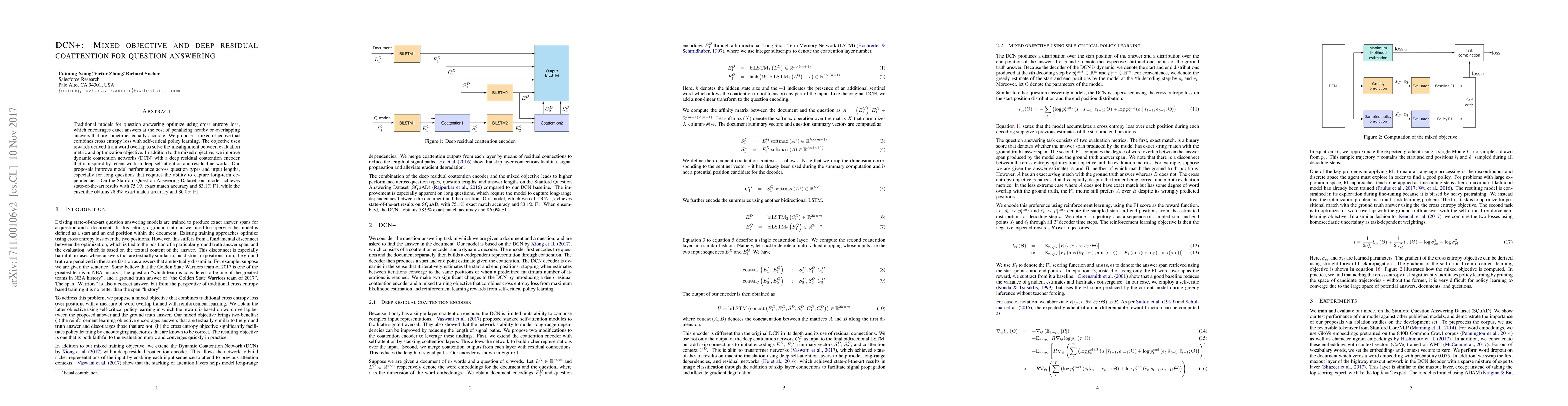 Traditional models for question answering optimize using cross entropy loss, which encourages exact answers at the cost of penalizing nearby or overlapping answers that are sometimes equally accurate. We propose a mixed objective that combines cross entropy loss with self-critical policy learning. The objective uses rewards derived from word overlap to solve the misalignment between evaluation metric and optimization objective. In addition to the mixed objective, we improve dynamic coattention networks (DCN) with a deep residual coattention encoder that is inspired by recent work in deep self-attention and residual networks. Our proposals improve model performance across question types and input lengths, especially for long questions that requires the ability to capture long-term dependencies. On the Stanford Question Answering Dataset, our model achieves state-of-the-art results with 75.1% exact match accuracy and 83.1% F1, while the ensemble obtains 78.9% exact match accuracy and 86.0% F1.