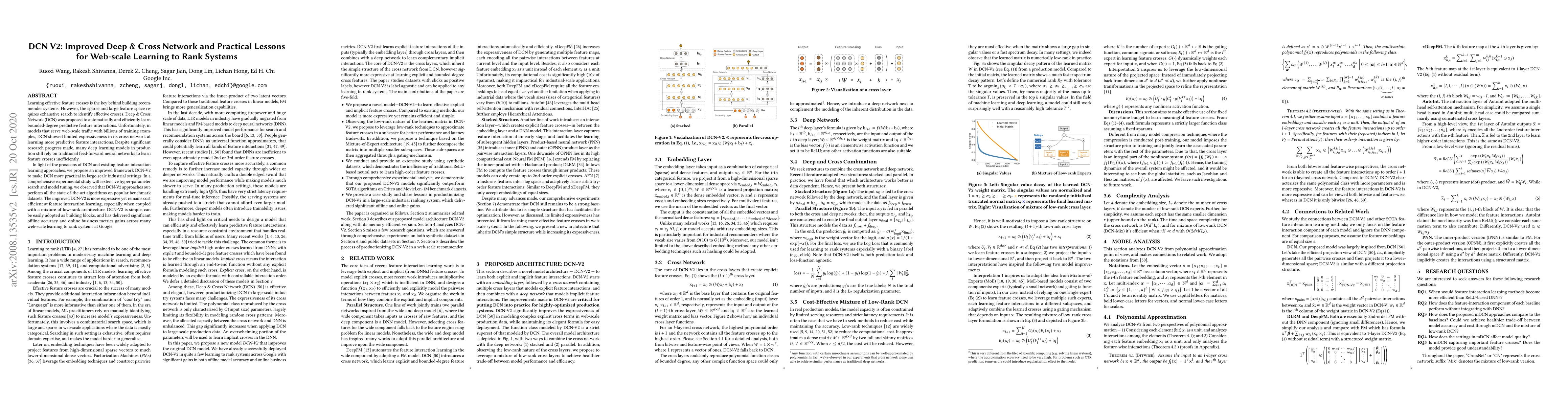 Learning effective feature crosses is the key behind building recommender systems. However, the sparse and large feature space requires exhaustive search to identify effective crosses. Deep & Cross Network (DCN) was proposed to automatically and efficiently learn bounded-degree predictive feature interactions. Unfortunately, in models that serve web-scale traffic with billions of training examples, DCN showed limited expressiveness in its cross network at learning more predictive feature interactions. Despite significant research progress made, many deep learning models in production still rely on traditional feed-forward neural networks to learn feature crosses inefficiently. In light of the pros/cons of DCN and existing feature interaction learning approaches, we propose an improved framework DCN-V2 to make DCN more practical in large-scale industrial settings. In a comprehensive experimental study with extensive hyper-parameter search and model tuning, we observed that DCN-V2 approaches outperform all the state-of-the-art algorithms on popular benchmark datasets. The improved DCN-V2 is more expressive yet remains cost efficient at feature interaction learning, especially when coupled with a mixture of low-rank architecture. DCN-V2 is simple, can be easily adopted as building blocks, and has delivered significant offline accuracy and online business metrics gains across many web-scale learning to rank systems at Google.