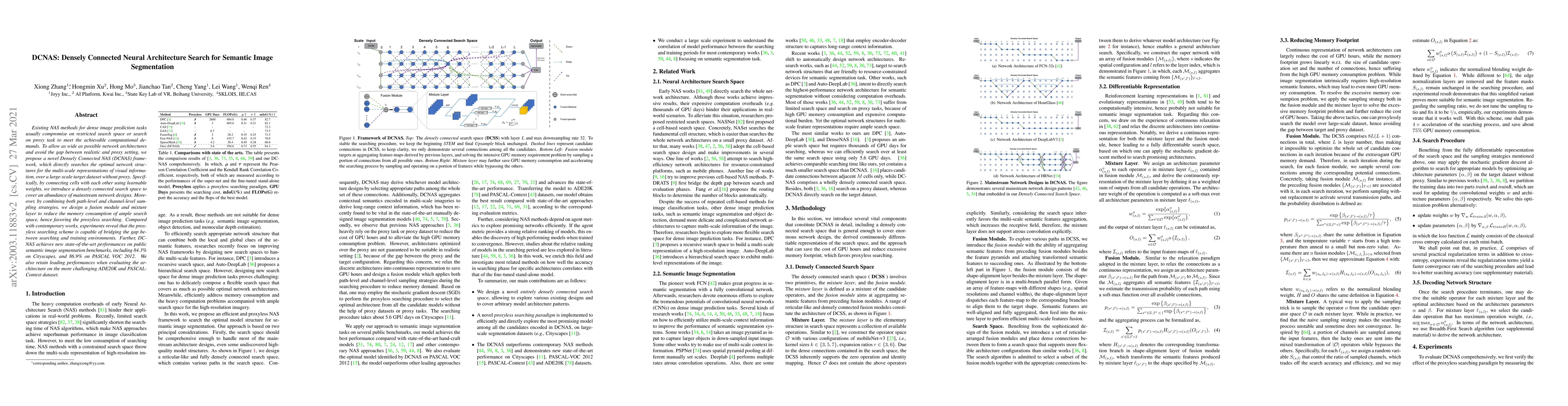 The DCNAS framework proposes a densely connected neural architecture search method for semantic image segmentation, directly optimizing network structures over a large-scale target dataset to achieve state-of-the-art performance on benchmarks like Cityscapes, PASCAL VOC 2012, ADE20K, and Pascal Context. It utilizes a fusion module combining path-level and channel-level sampling to manage memory consumption effectively.