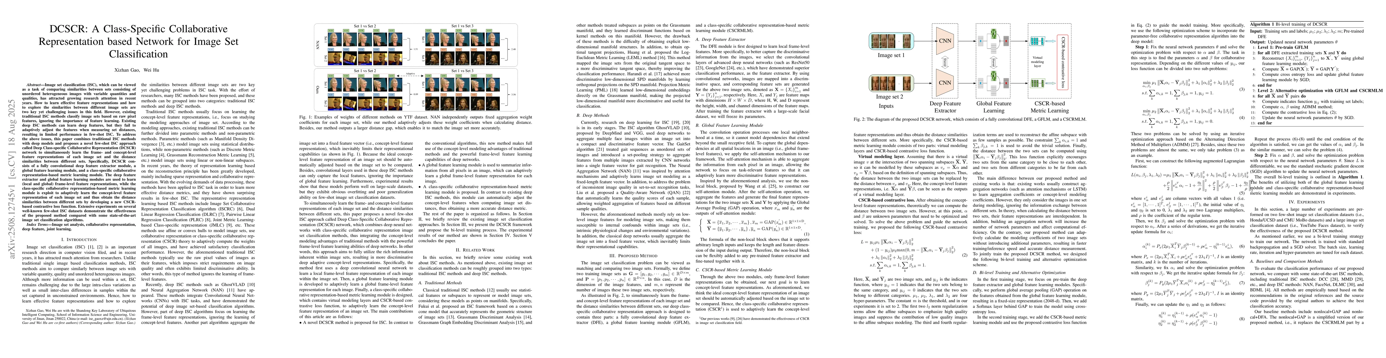 Image set classification (ISC), which can be viewed as a task of comparing similarities between sets consisting of unordered heterogeneous images with variable quantities and qualities, has attracted growing research attention in recent years. How to learn effective feature representations and how to explore the similarities between different image sets are two key yet challenging issues in this field. However, existing traditional ISC methods classify image sets based on raw pixel features, ignoring the importance of feature learning. Existing deep ISC methods can learn deep features, but they fail to adaptively adjust the features when measuring set distances, resulting in limited performance in few-shot ISC. To address the above issues, this paper combines traditional ISC methods with deep models and proposes a novel few-shot ISC approach called Deep Class-specific Collaborative Representation (DCSCR) network to simultaneously learn the frame- and concept-level feature representations of each image set and the distance similarities between different sets. Specifically, DCSCR consists of a fully convolutional deep feature extractor module, a global feature learning module, and a class-specific collaborative representation-based metric learning module. The deep feature extractor and global feature learning modules are used to learn (local and global) frame-level feature representations, while the class-specific collaborative representation-based metric learning module is exploit to adaptively learn the concept-level feature representation of each image set and thus obtain the distance similarities between different sets by developing a new CSCR-based contrastive loss function. Extensive experiments on several well-known few-shot ISC datasets demonstrate the effectiveness of the proposed method compared with some state-of-the-art image set classification algorithms.
