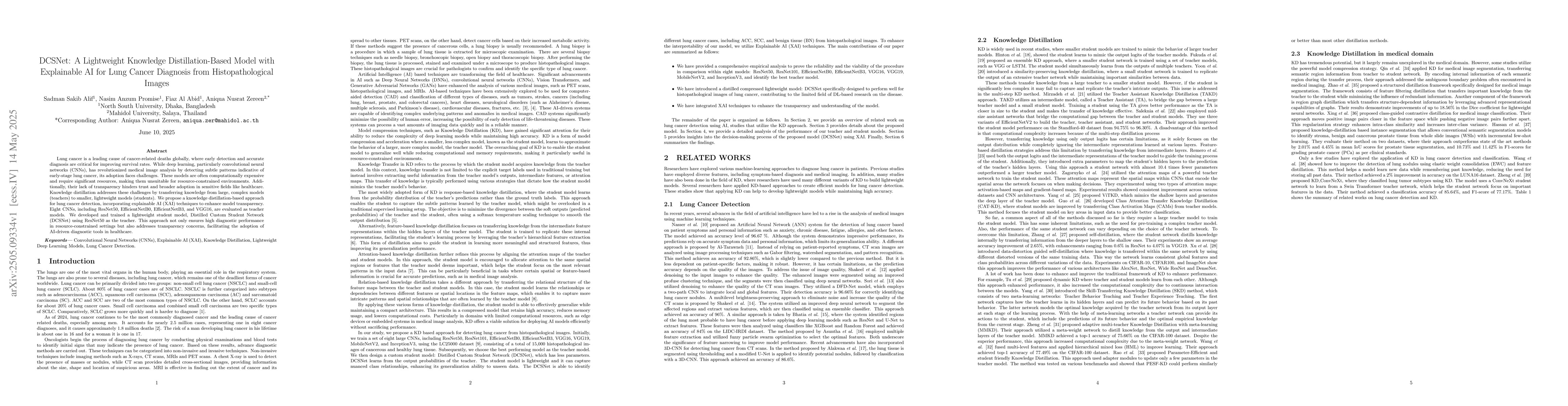 The main technical contribution is the development of DCSNet, a lightweight knowledge distillation-based model incorporating XAI for transparent and efficient lung cancer diagnosis from histopathological images.