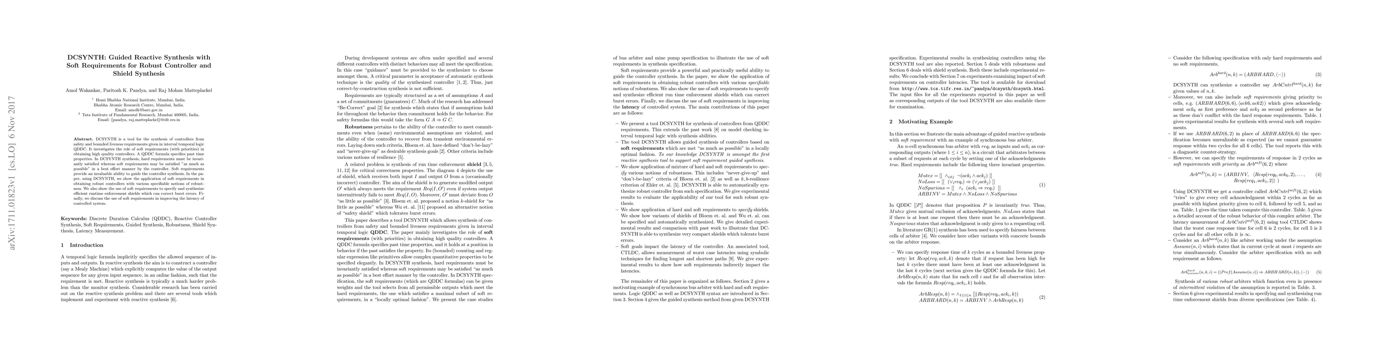 DCSYNTH synthesizes controllers from safety and bounded liveness requirements using interval temporal logic QDDC, prioritizing soft requirements to guide synthesis. It demonstrates the effectiveness of soft requirements in generating robust controllers and runtime enforcement shields for error correction.