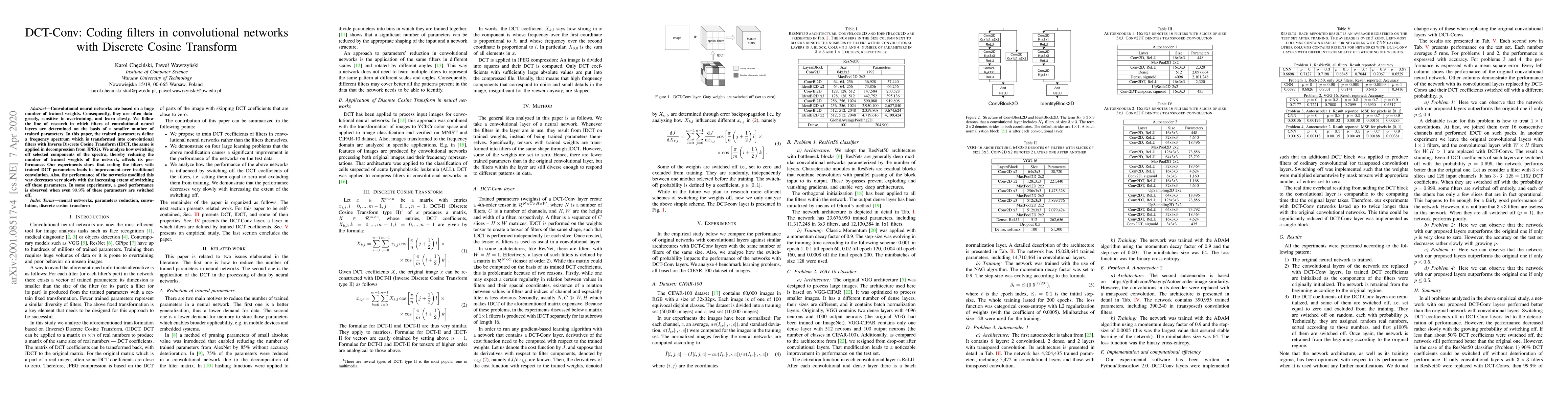 This paper proposes using Discrete Cosine Transform (DCT) to code convolutional filters in neural networks, reducing the number of trained parameters. Experiments show that this approach improves performance over traditional convolution and maintains effectiveness even when nearly all DCT parameters are switched off.