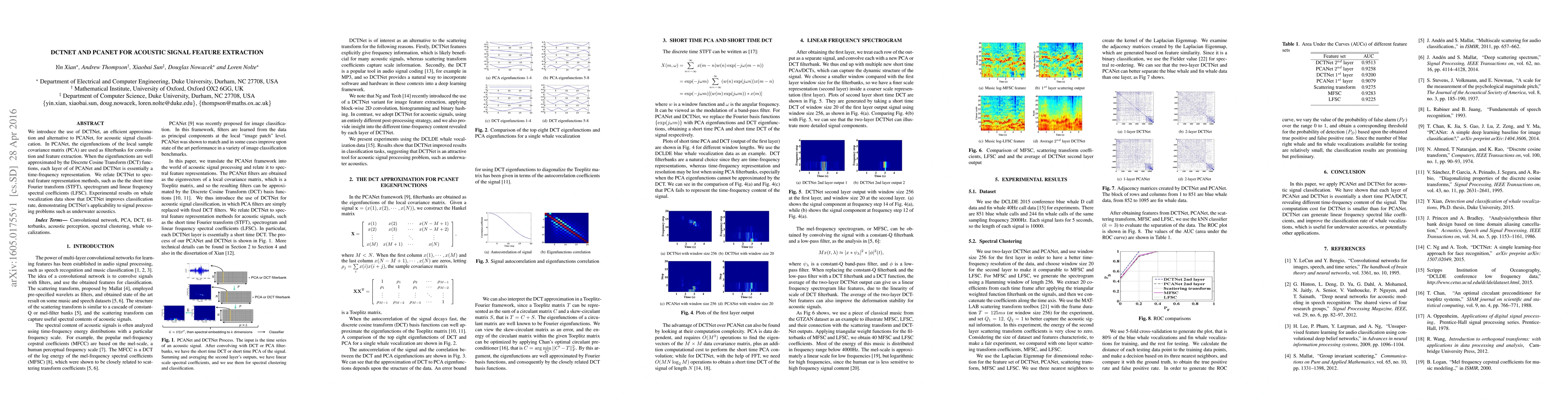 We introduce the use of DCTNet, an efficient approximation and alternative to PCANet, for acoustic signal classification. In PCANet, the eigenfunctions of the local sample covariance matrix (PCA) are used as filterbanks for convolution and feature extraction. When the eigenfunctions are well approximated by the Discrete Cosine Transform (DCT) functions, each layer of of PCANet and DCTNet is essentially a time-frequency representation. We relate DCTNet to spectral feature representation methods, such as the the short time Fourier transform (STFT), spectrogram and linear frequency spectral coefficients (LFSC). Experimental results on whale vocalization data show that DCTNet improves classification rate, demonstrating DCTNet's applicability to signal processing problems such as underwater acoustics.
