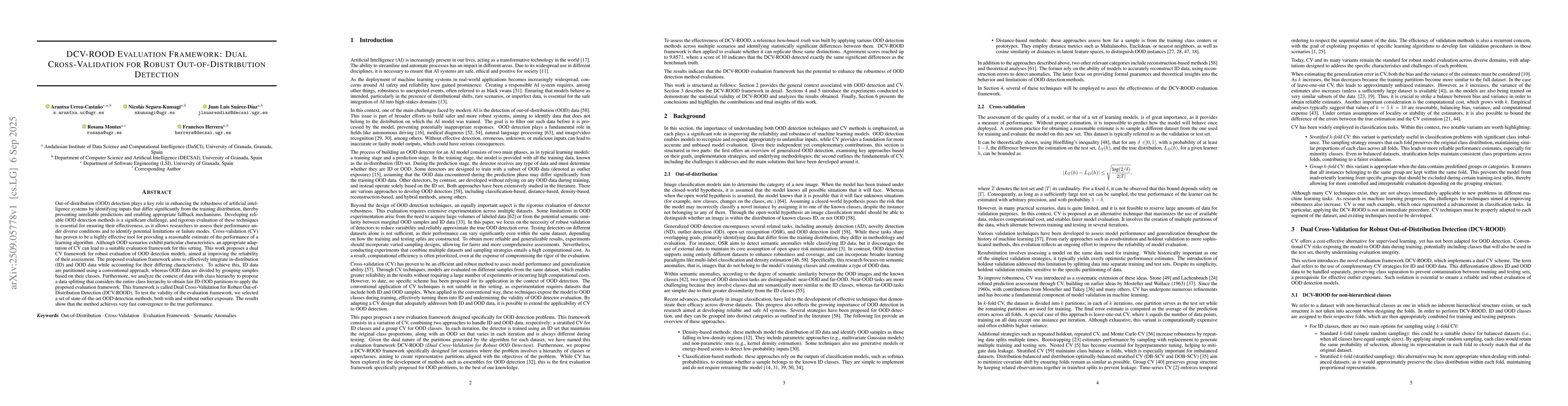 Out-of-distribution (OOD) detection plays a key role in enhancing the robustness of artificial intelligence systems by identifying inputs that differ significantly from the training distribution, thereby preventing unreliable predictions and enabling appropriate fallback mechanisms. Developing reliable OOD detection methods is a significant challenge, and rigorous evaluation of these techniques is essential for ensuring their effectiveness, as it allows researchers to assess their performance under diverse conditions and to identify potential limitations or failure modes. Cross-validation (CV) has proven to be a highly effective tool for providing a reasonable estimate of the performance of a learning algorithm. Although OOD scenarios exhibit particular characteristics, an appropriate adaptation of CV can lead to a suitable evaluation framework for this setting. This work proposes a dual CV framework for robust evaluation of OOD detection models, aimed at improving the reliability of their assessment. The proposed evaluation framework aims to effectively integrate in-distribution (ID) and OOD data while accounting for their differing characteristics. To achieve this, ID data are partitioned using a conventional approach, whereas OOD data are divided by grouping samples based on their classes. Furthermore, we analyze the context of data with class hierarchy to propose a data splitting that considers the entire class hierarchy to obtain fair ID-OOD partitions to apply the proposed evaluation framework. This framework is called Dual Cross-Validation for Robust Out-of-Distribution Detection (DCV-ROOD). To test the validity of the evaluation framework, we selected a set of state-of-the-art OOD detection methods, both with and without outlier exposure. The results show that the method achieves very fast convergence to the true performance.